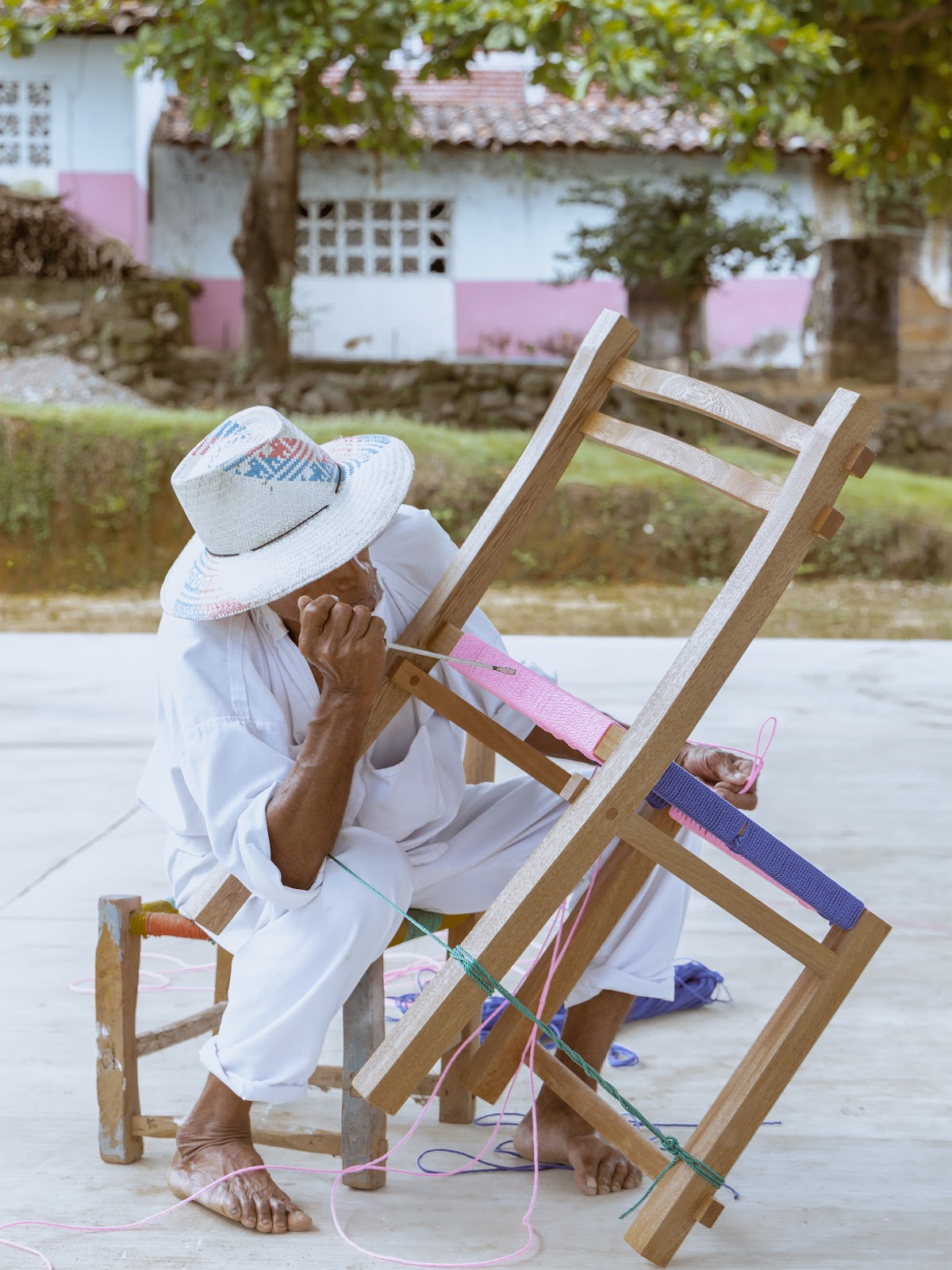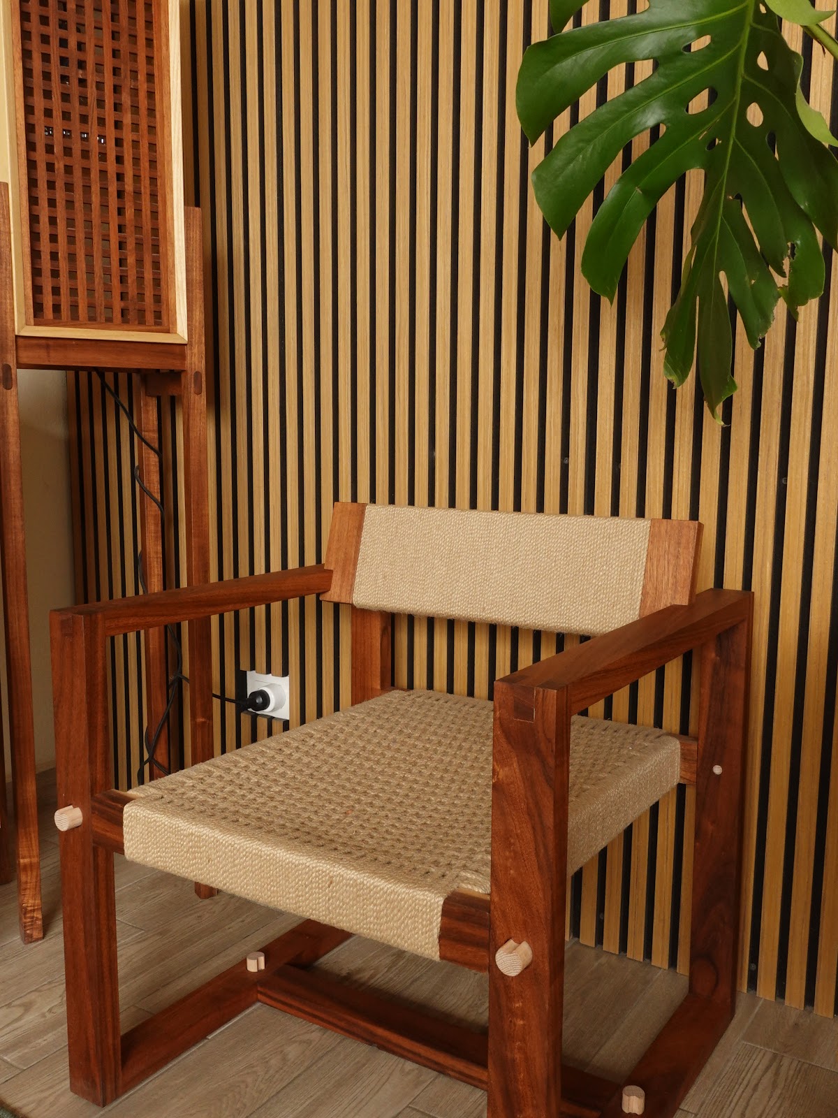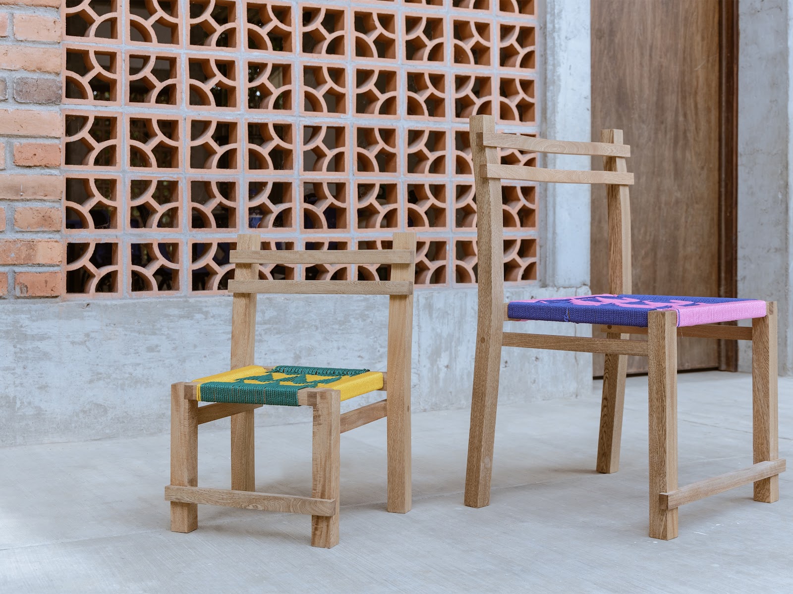 El conjunto está compuesto por la silla Kulen’, la lámpara Misbah y la mesa lateral Óox, piezas que comparten la fabricación artesanal mediante ensambles. La silla Kulen’, cuyo nombre en maya significa “sentarse”, está elaborada en madera de tzalam con botones de encino y asiento tejido en fibras. Su diseño desmontable incorpora ensambles de caja y espiga ocultos, optimizando transporte y almacenamiento, al mismo tiempo que conserva la ergonomía necesaria para la lectura o el descanso. La lámpara Misbah, que en árabe significa “luz”, proyecta iluminación a través de una celosía en tzalam, sostenida por una estructura y cajón de triplay de sande. La mesa lateral Óox, también en tzalam, emplea ensambles de caja y espiga, completando un conjunto que fusiona tradición artesanal con diseño contemporáneo.