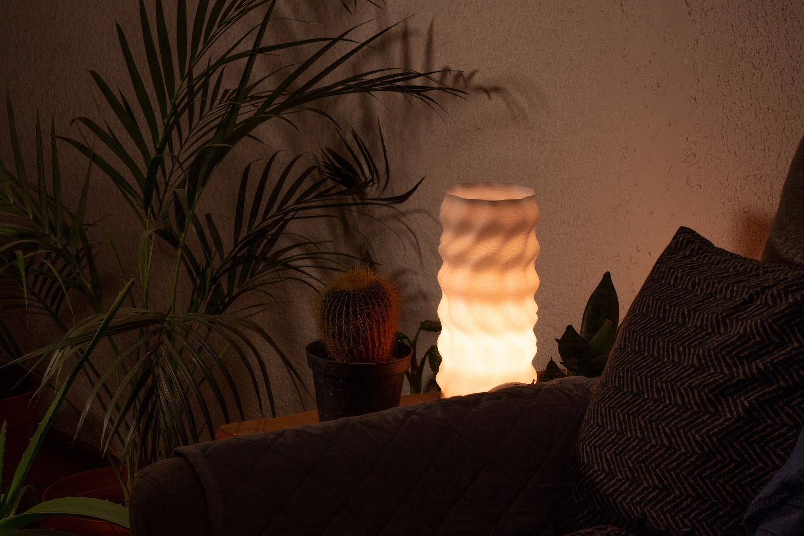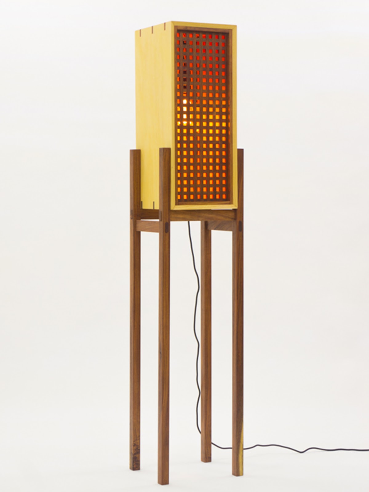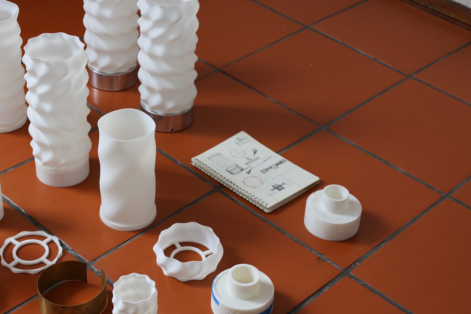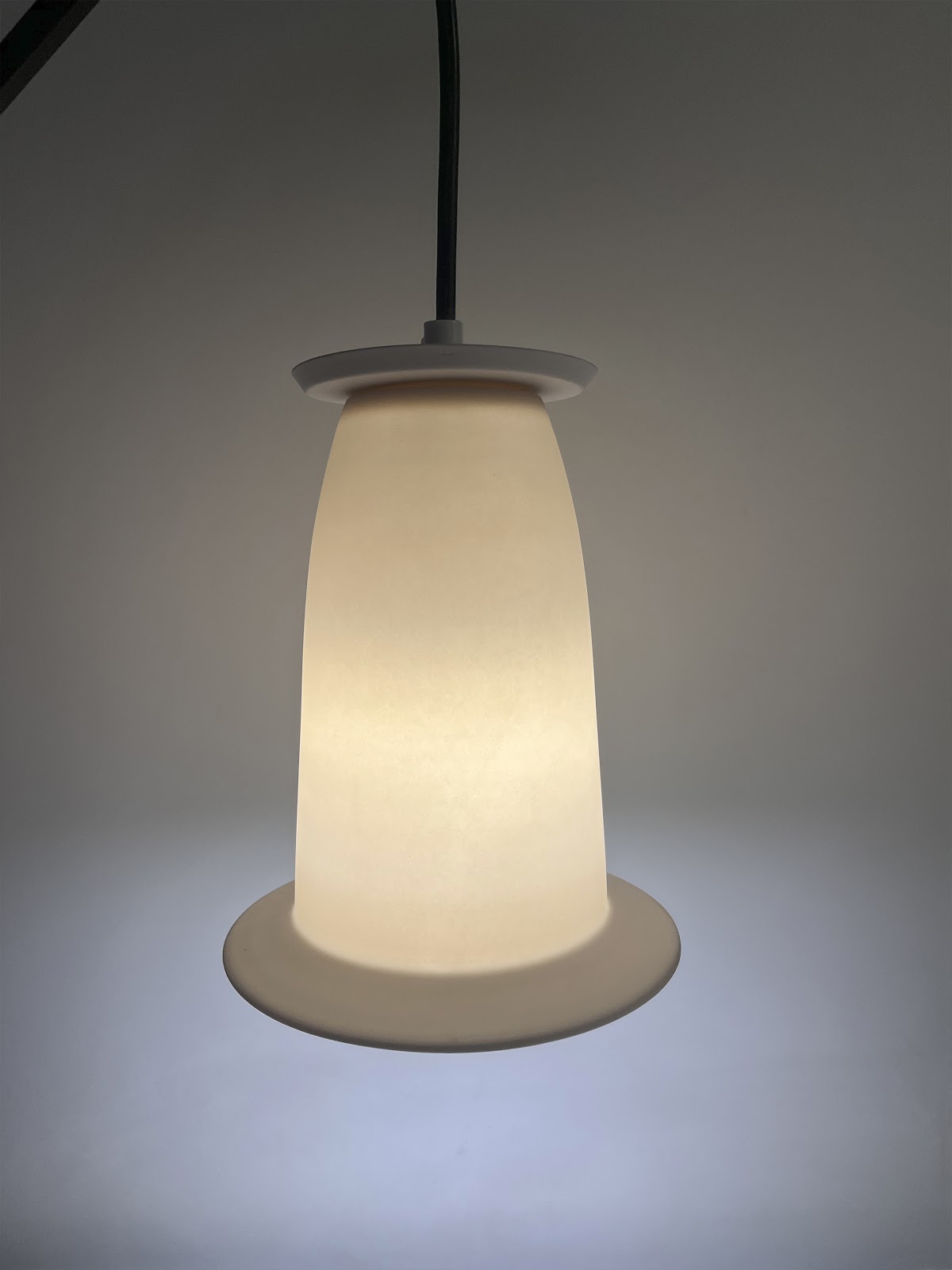 Características La lámpara está conformada por tres partes principales: un cable de 1.5 m de longitud con dimmer integrado para controlar la intensidad de la luz; una base que funciona como enlace entre el cable y la bombilla; y una pantalla cilíndrica que dispersa la luz en el espacio donde se coloca. La base está recubierta con una lámina de aluminio inoxidable, cuya función es reflejar el entorno en su superficie y aportar una sensación de ligereza al diseño. Proceso La pantalla y la base se desarrollan mediante diseño paramétrico utilizando las herramientas de modelado Rhino Ceros y Grasshopper. Posteriormente, se materializan a través de impresión 3D con filamento reciclado en color blanco. Materiales Cable textil calibre 18 con atenuador de luz tipo perilla. Base: pieza impresa en 3D con filamento reciclado, recubierta con lámina de aluminio calibre 22. Pantalla: pieza impresa en 3D con filamento reciclado (11 cm x 24 cm), acompañada de un foco LED E27.