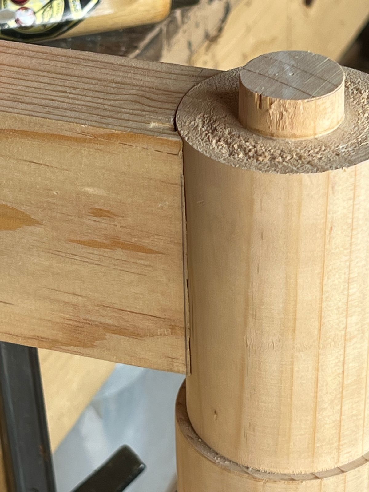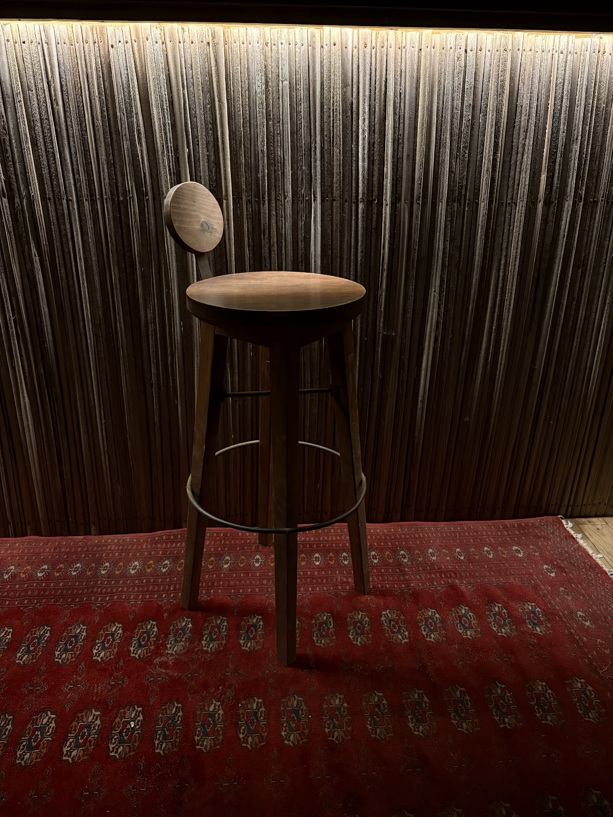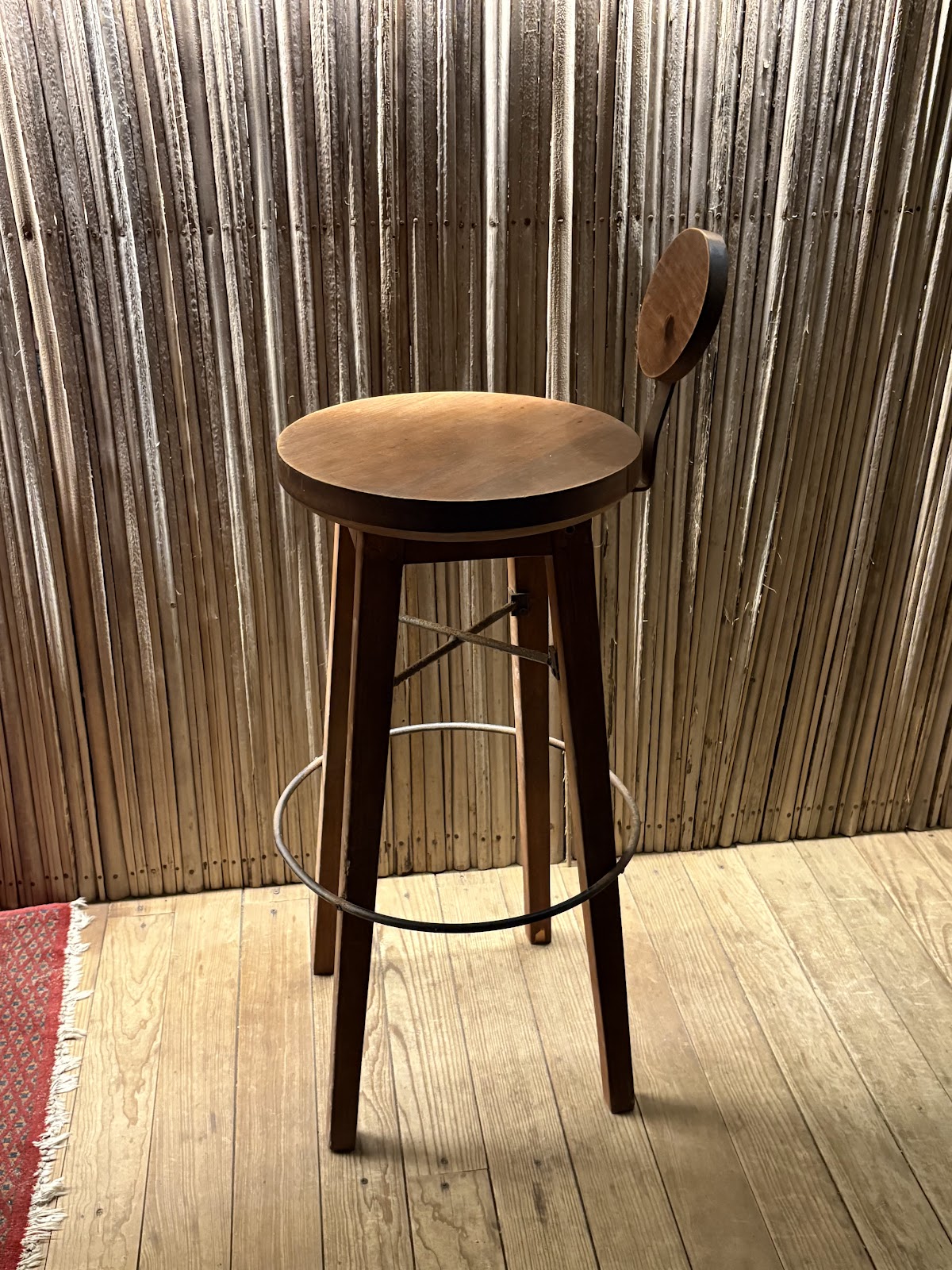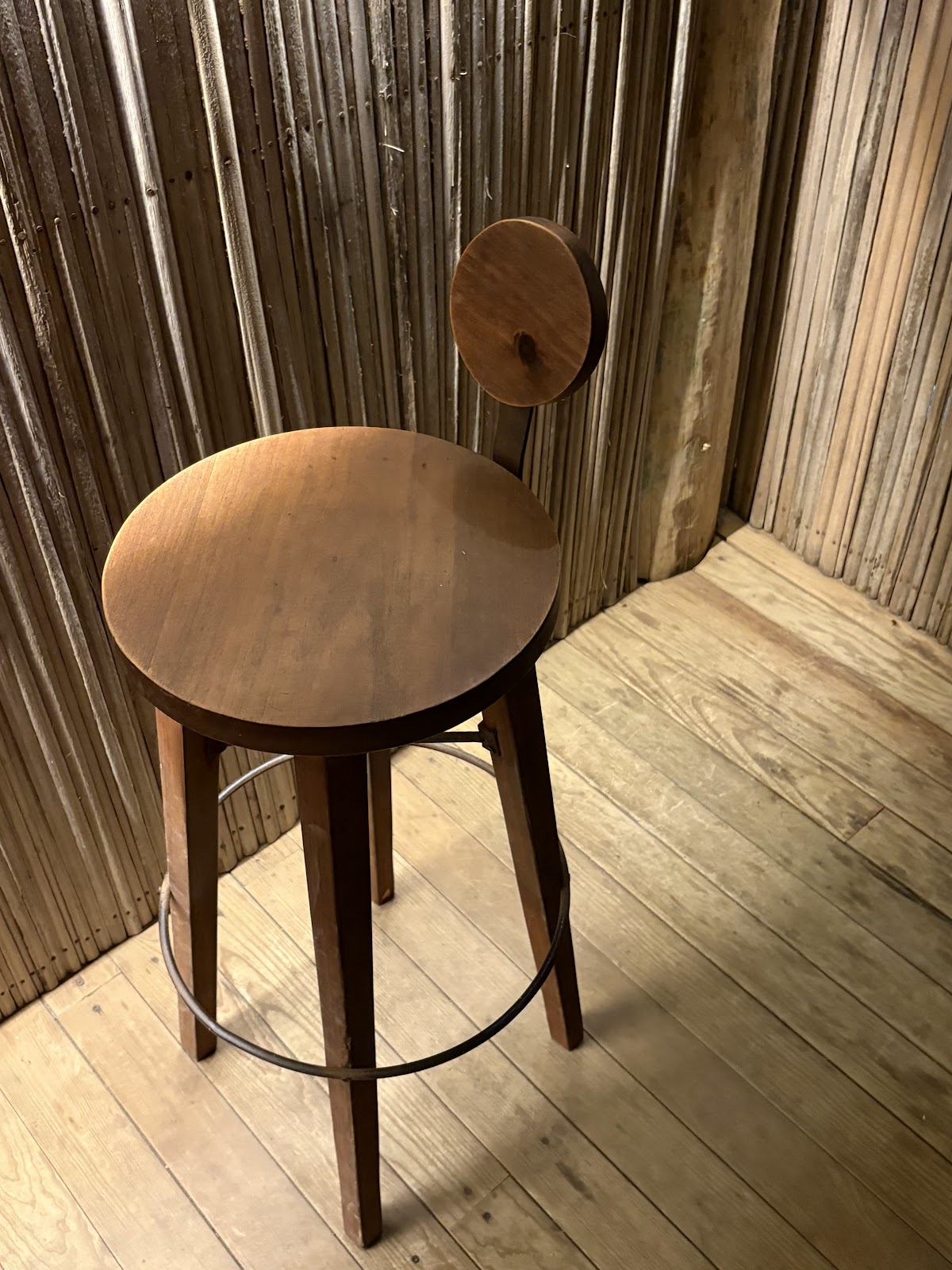 Silla periquera hecha de madera de pino con herrería de acero, diseñada y elaborada para bar Anzuelo en Puerto Escondido, Oaxaca.