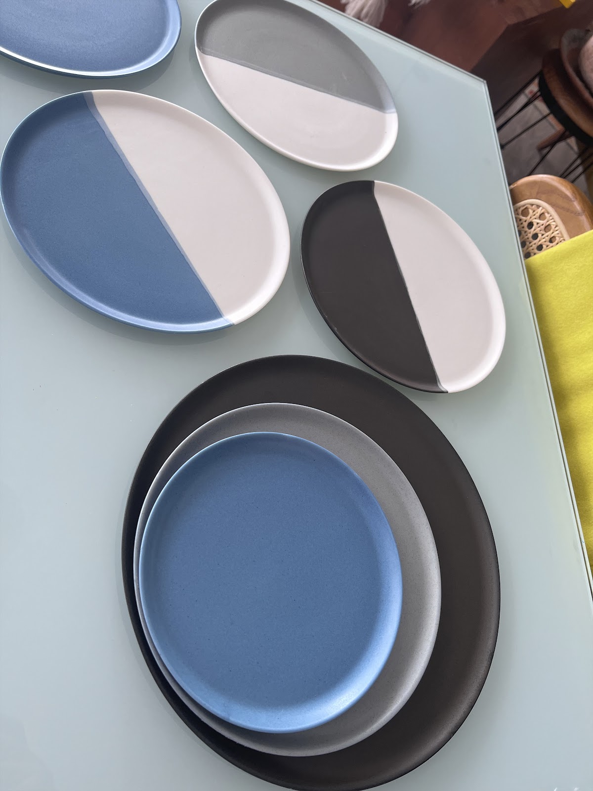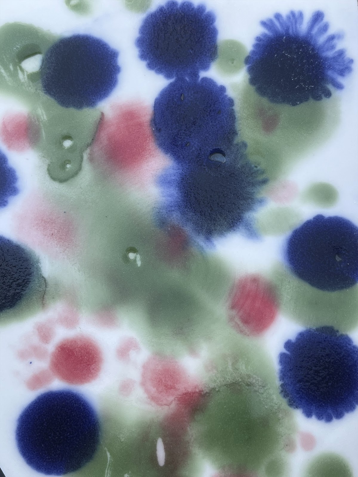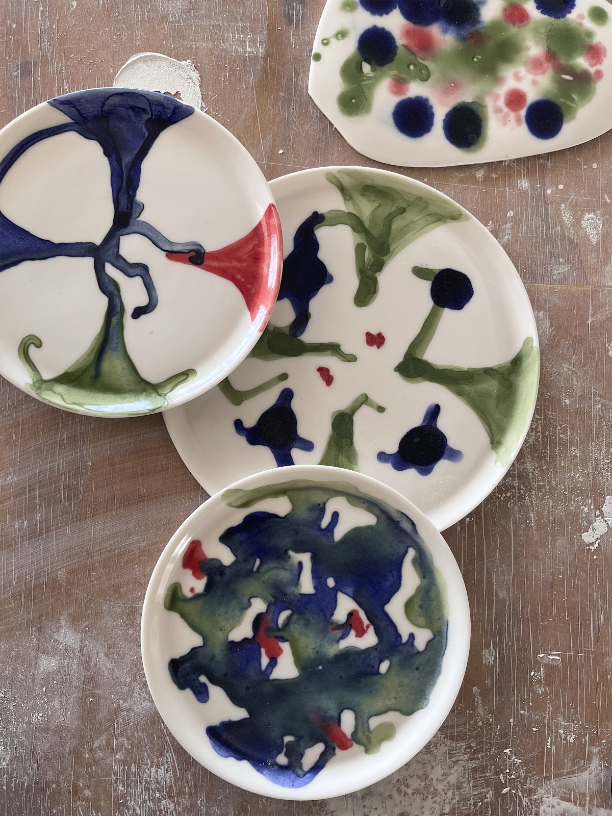 Platos experimentales En estos platos, la decoración se concibe como un campo de prueba donde el color no es una verdad estable, sino una relación en tránsito. Su manifestación está siempre condicionada por el contraste, el soporte y el contexto; nunca actúa de manera autónoma. La experimentación no busca establecer una paleta definitiva, sino permitir que cada intervención dialogue con la porcelana, con la luz y con los accidentes del proceso. Estos objetos registran una investigación sobre cómo se transforma el sentido del color al aplicarse sobre un material tan radicalmente blanco y exigente, que obliga a percibir cada matiz como si fuera nuevo.