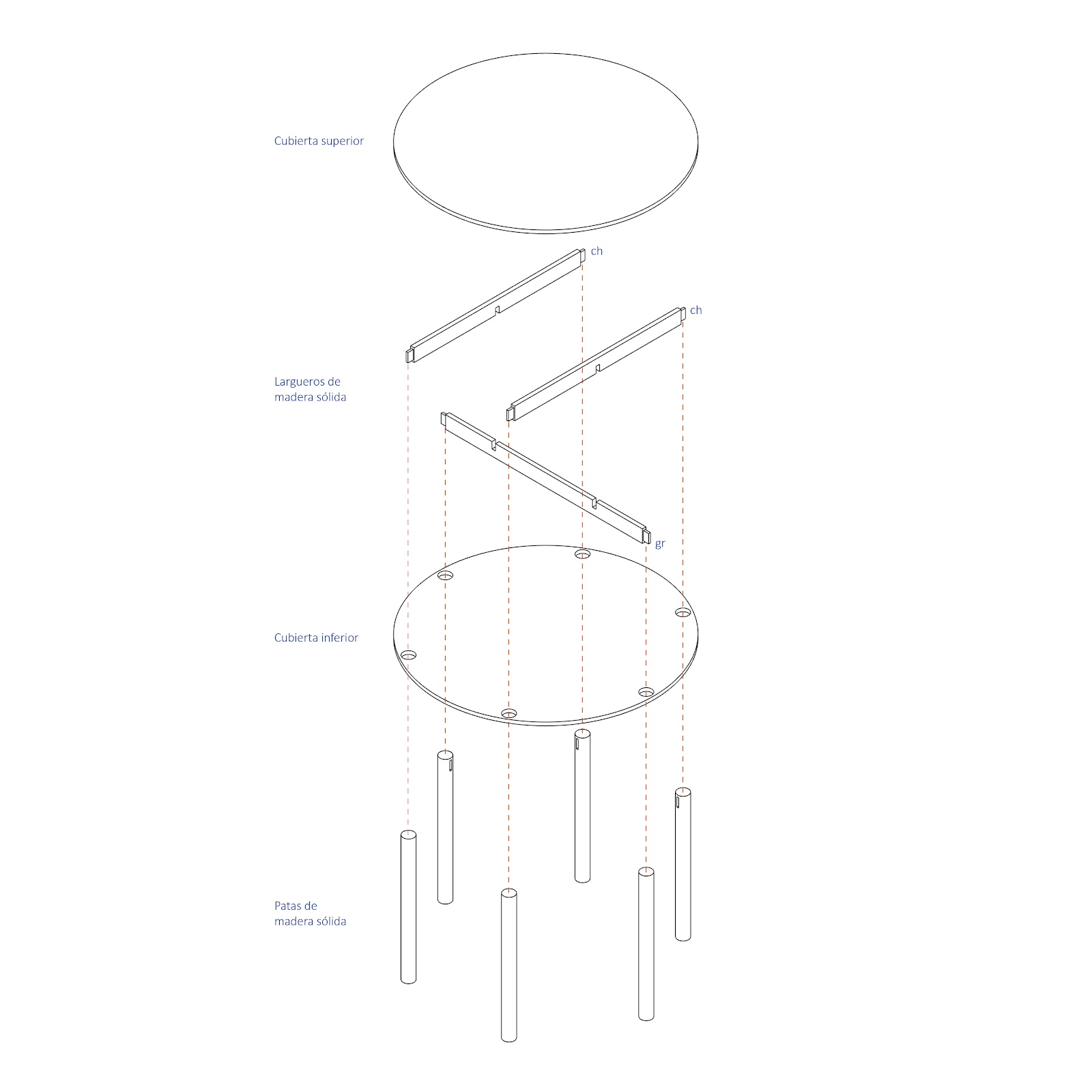 Se trata de una mesa de estructura sólida, ensamblada sin herrajes y fabricable con maderas locales y triplay industrial. Diseñada para ser funcional, flexible y accesible, ofrece seis espacios destinados a usos diversos. Su proceso optimiza materiales al obtener ambas cubiertas de un solo panel y permite su construcción con conocimientos básicos de carpintería, adaptándose a distintos contextos, necesidades y gustos. El diseño busca generar un objeto bello, útil y duradero, fácilmente replicable, que habite un espacio intermedio entre la producción en masa y el diseño inaccesible: una propuesta que pone la calidad y el buen diseño al alcance de más personas, sin renunciar a la estética ni a la ética.