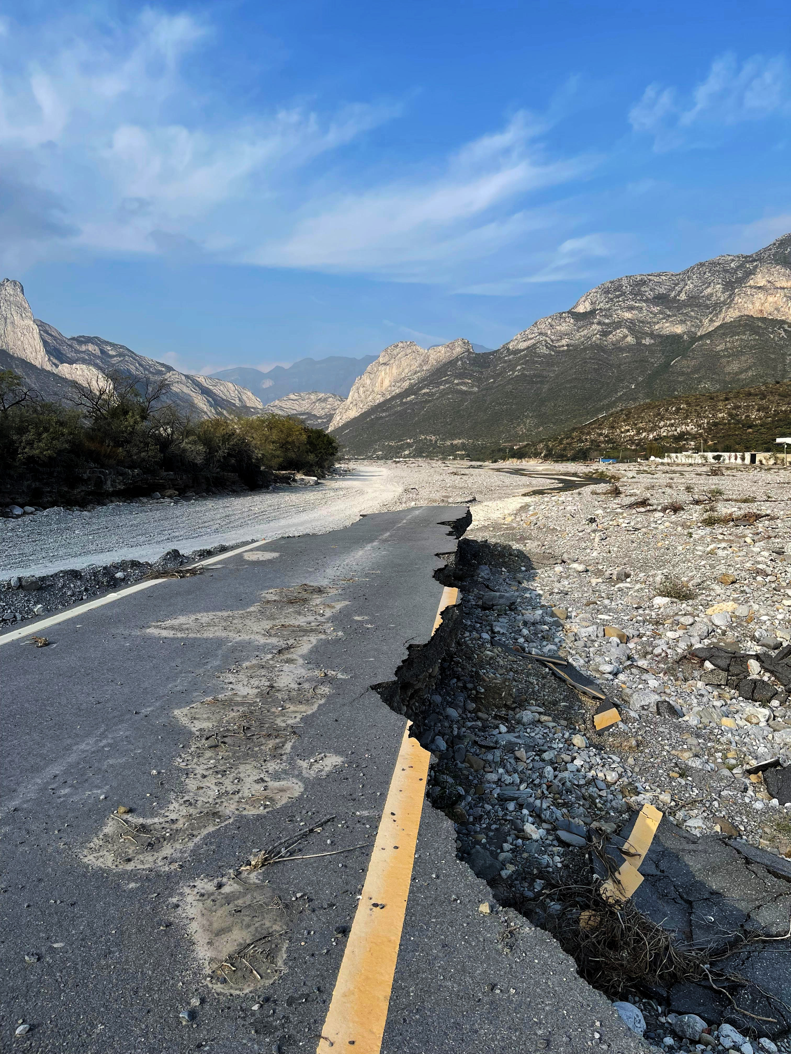 Mesa ocasional de altura ajustable hecha con un pedazo de pavimento de la carretera en el Parque Ecológico "La Huasteca", NL, producto de la destrucción ocasionada por el huracán Alberto en 2024.