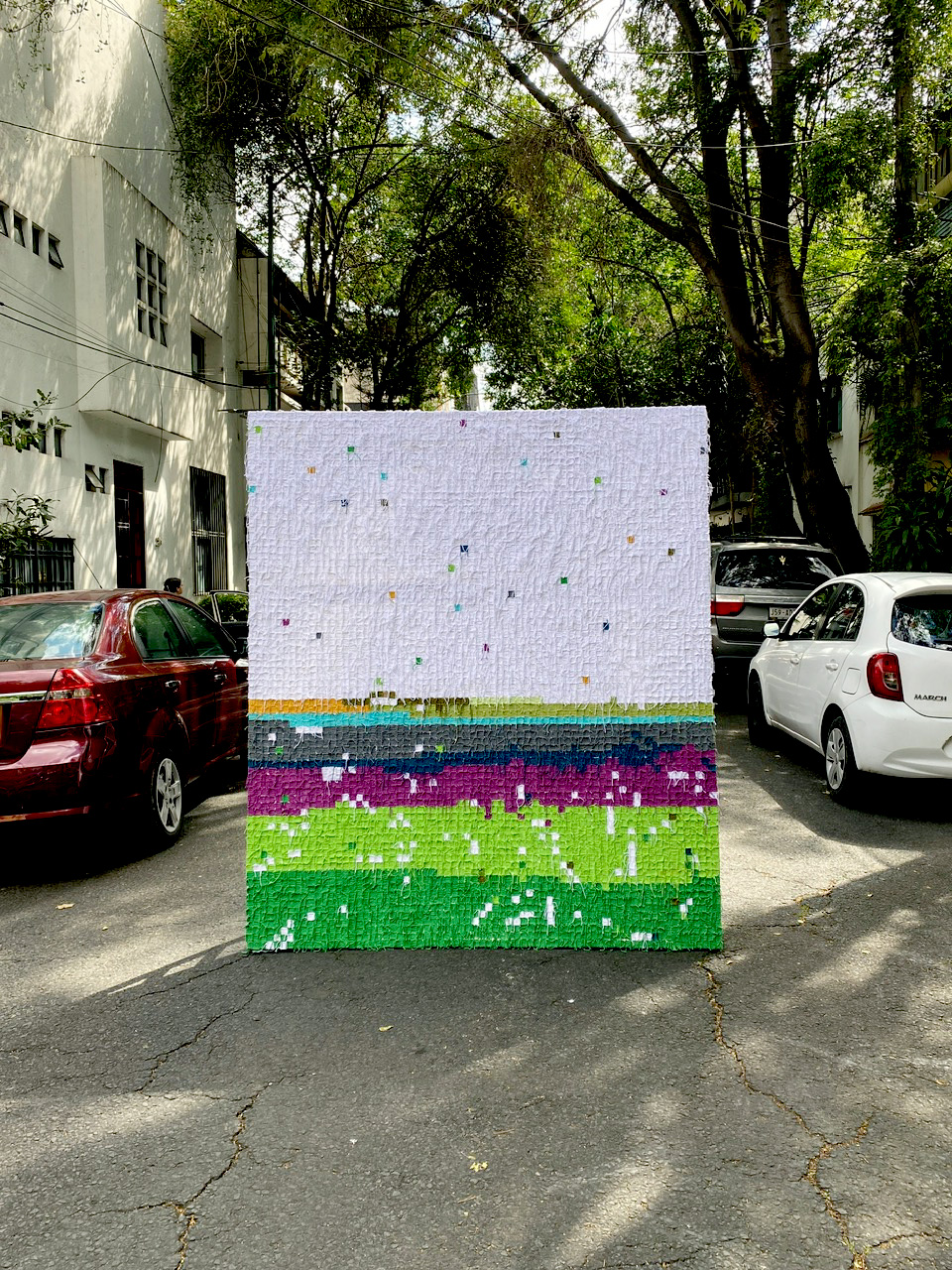 TTJaja es una colectiva de mujeres tejedoras que ha formado una comunidad creativa que desafía las normas tradicionales del arte textil. A través de obras de gran formato, coloridas y lúdicas, el colectivo se inspira en su entorno para crear piezas que celebran el hacer colectivo.Esta obra surge a partir de una reflexión sobre el medio ambiente y el cambio climático. Cada color representa la diversidad y distribución de los ecosistemas presentes en la Ciudad de México. Cada cuadrito tejido es una unidad viva que, al unirse con otros, forma un paisaje simbólico que muestra cómo estos ambientes se reparten en una ciudad percibida como completamente urbana. La pieza comenzó como una activación en el evento What Design Can Do2024, donde más de 60 personas aprendieron a tejer y participaron en la obra en tiempo real. La respuesta fue tan positiva que luego se lanzó una convocatoria por redes sociales, invitando a más personas a tejer desde casa.El objetivo fue crear una obra colaborativa de 2.3 x 3 metros, compuesta por cuadritos de 3 x 3 cm.Además de representar visualmente los ecosistemas urbanos, la pieza es un testimonio de la fuerza del trabajo colectivo. Tejer en comunidad es también conversar, compartir historias, reír y generar lazos. Aunque la invitación fue abierta a todes, el 90% de quienes participaron fueron mujeres: tejedoras que, mientras crean con sus manos, construyen también redes de afecto y resistencia.