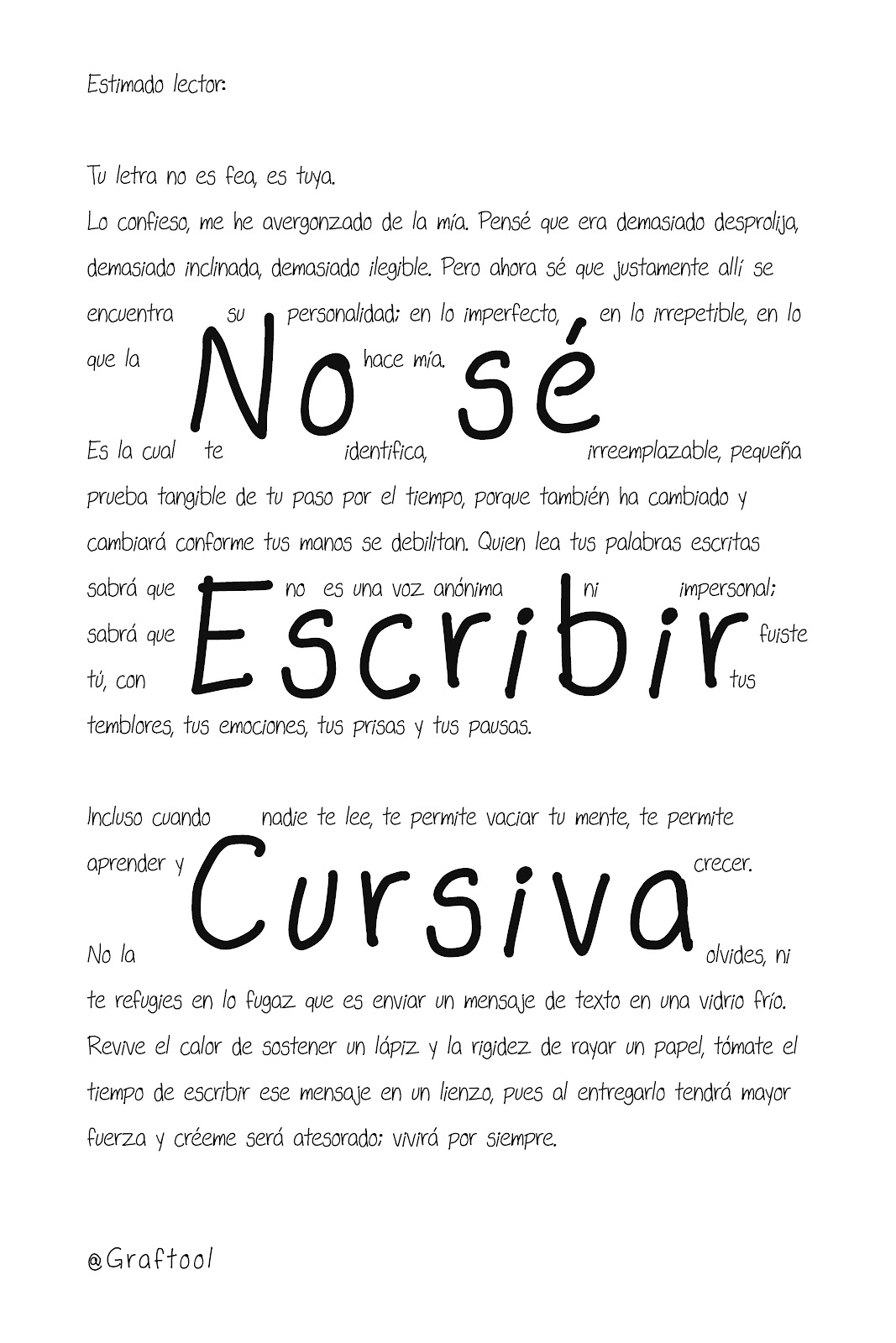 Ver semblanzaGraftool es un proyecto que difunde la importancia y la conservación de la escritura a mano. Desde un garabato hecho al teléfono hasta la práctica de la caligrafía, explora tanto su dimensión artística como los beneficios que aporta a la concentración, la relajación y el desarrollo de técnicas. El proyecto busca recordarle a quien se acerque que, ya sea a través de una carta o un pequeño mensaje, la escritura puede marcar la diferencia para reconectar con quienes más importan, o incluso detonar una nueva pasión.