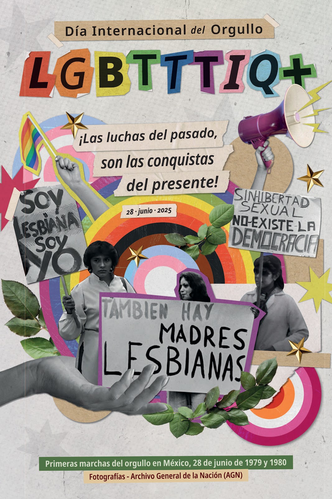 El cartel del Día del Orgullo 2025 recupera imágenes del Archivo General de la Nación de las primeras marchas de 1979 y 1980 en México, conectando memoria y presente. Su propuesta visibiliza maternidades lésbicas y la libertad sexual como un derecho irrenunciable. El diseño se concibe como un acto gráfico de insumisión: memoria que se proyecta al futuro y disidencia que se transforma en comunidad viva. Las imágenes históricas se reactivan como gesto de resistencia que sigue floreciendo en las calles, fortaleciendo la esperanza colectiva, al tiempo que amplían el imaginario sobre afectos y maternidades disidentes, visibilizando formas de creación y cuidado históricamente invisibilizadas.