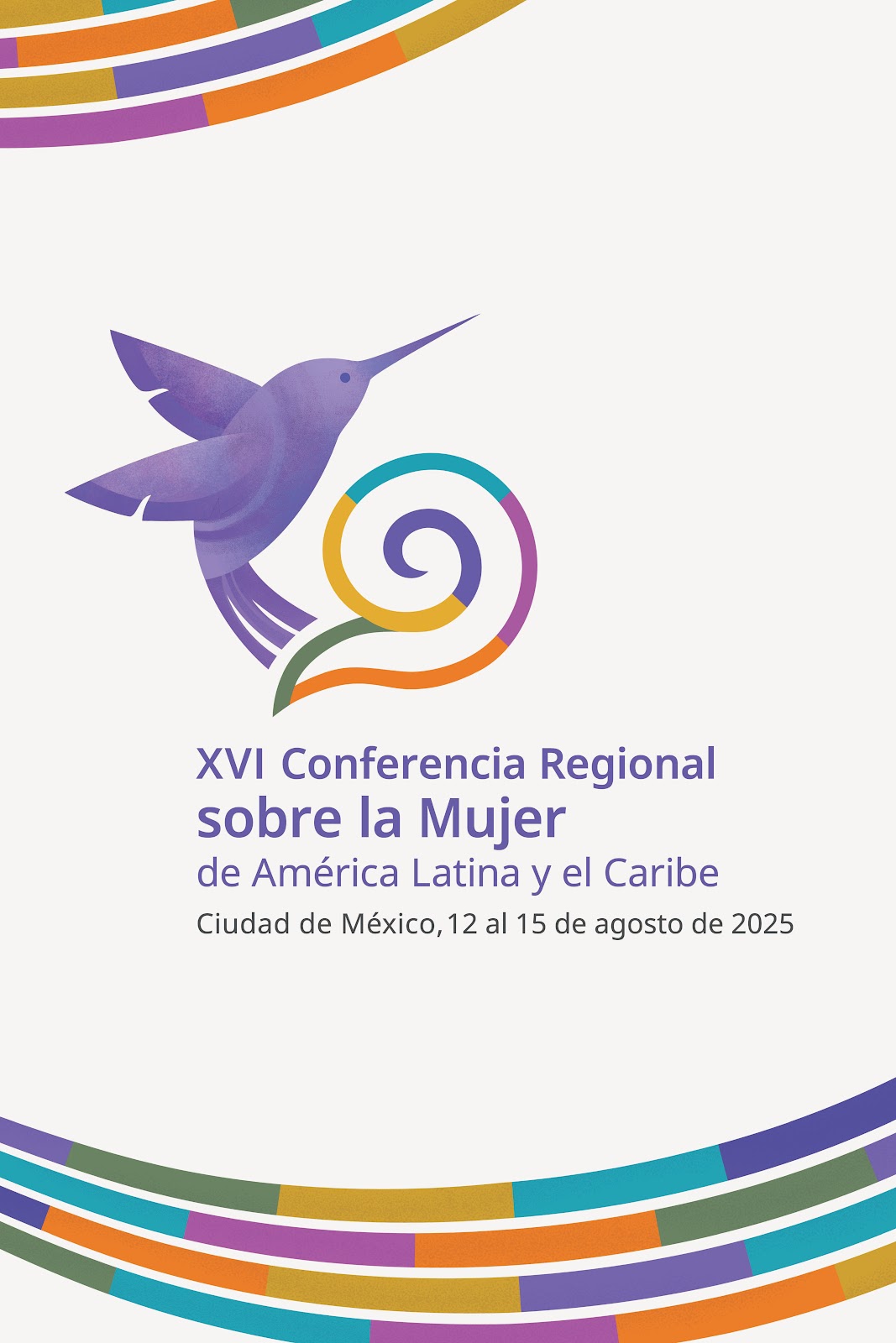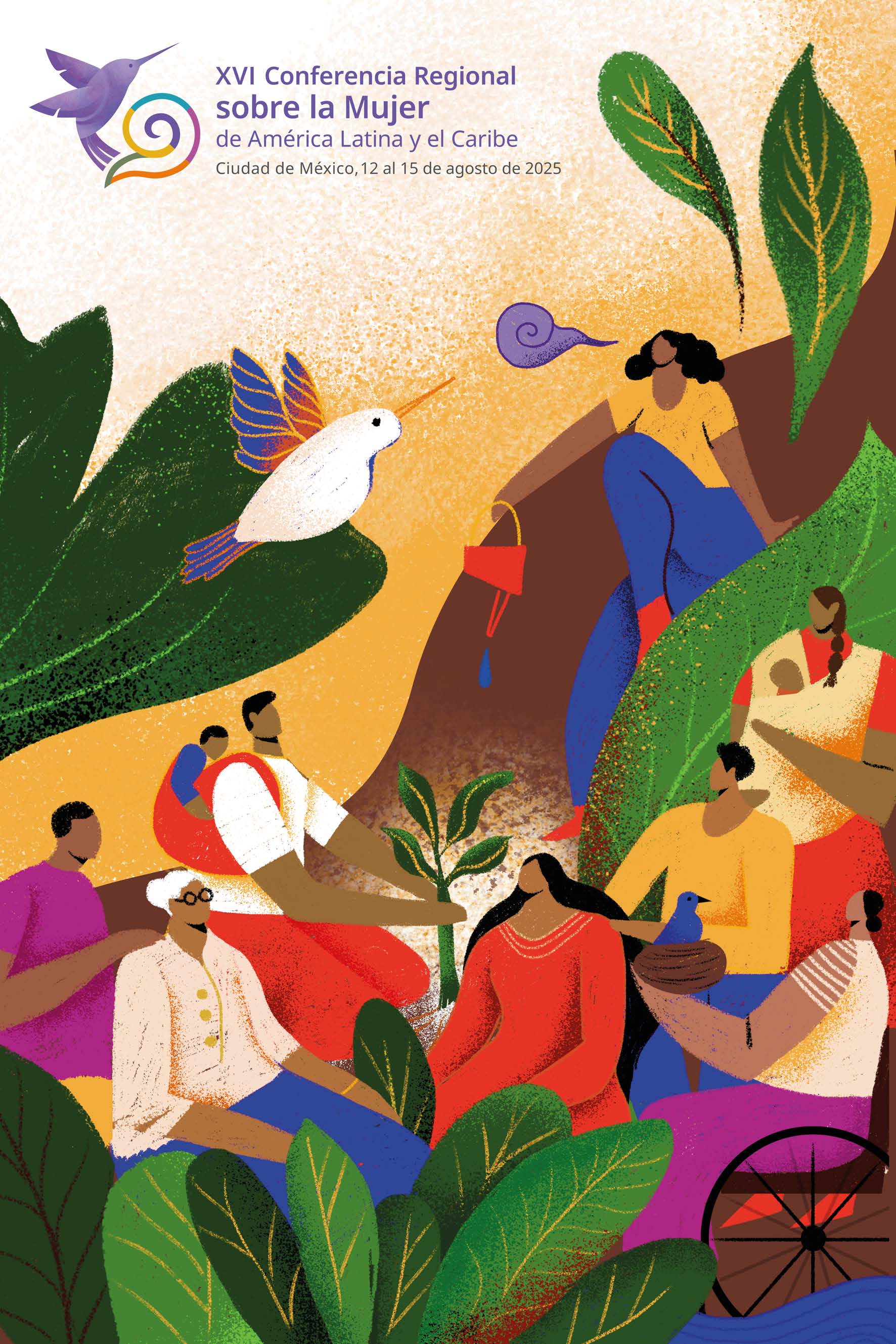 El cartel oficial de la XVI Conferencia Regional sobre la Mujer de América Latina y el Caribe une dos símbolos significativos: el colibrí, nativo de la región, y la vírgula del habla. Aunque pequeño, sostiene el equilibrio de la vida y del planeta; poliniza, vincula y transforma, recordando que lo mínimo puede ser lo más poderoso. La vírgula, inspirada en saberes ancestrales, representa la palabra que convoca y crea comunidad. Juntos evocan el poder de la voz y la acción colectiva para sostener la vida y transformar la realidad. El cartel invita a reconocer que solo con cuidados hay futuro y que cada gesto y palabra construyen sociedades más justas y sostenibles.