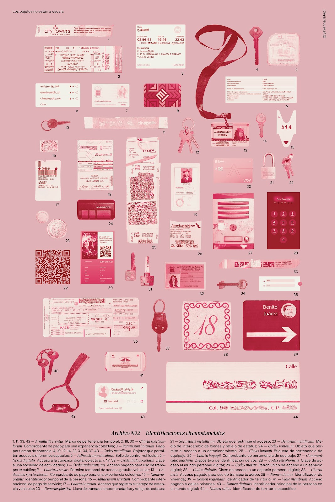 La colección de tres carteles funciona como un archivo arqueológico de nuestra era, nacida de la inquietud del autor sobre cómo se ha construido un ecosistema complejo de objetos que, sin ellos, pasaríamos inadvertidos. Cada cartel clasifica estos objetos según su función: aquellos que validan nuestra existencia, los que autorizan nuestro acceso y movilidad, y los sistemas preconfigurados que facilitan la interacción y la expresión personal. La obra evidencia cómo muchos de estos objetos, que aparentan ofrecer libertad y pertenencia, en realidad forman parte de un entramado de control social. Tras la realización de la serie, el autor reconoce que surgieron más preguntas de las que tenía al iniciar el proyecto, invitando a quien los observe a sumarse a esta reflexión crítica sobre los mecanismos que determinan nuestra validez en el mundo.
