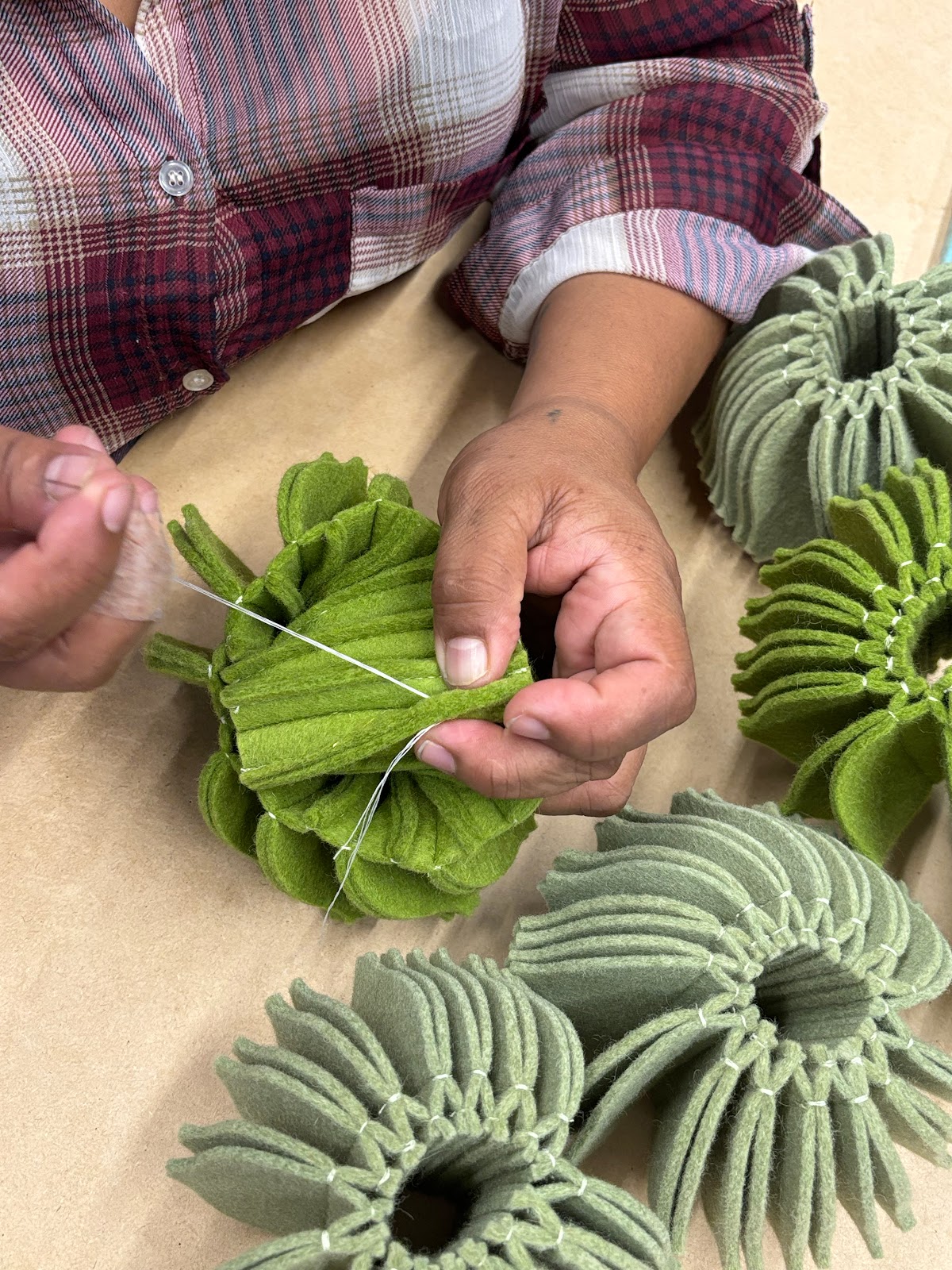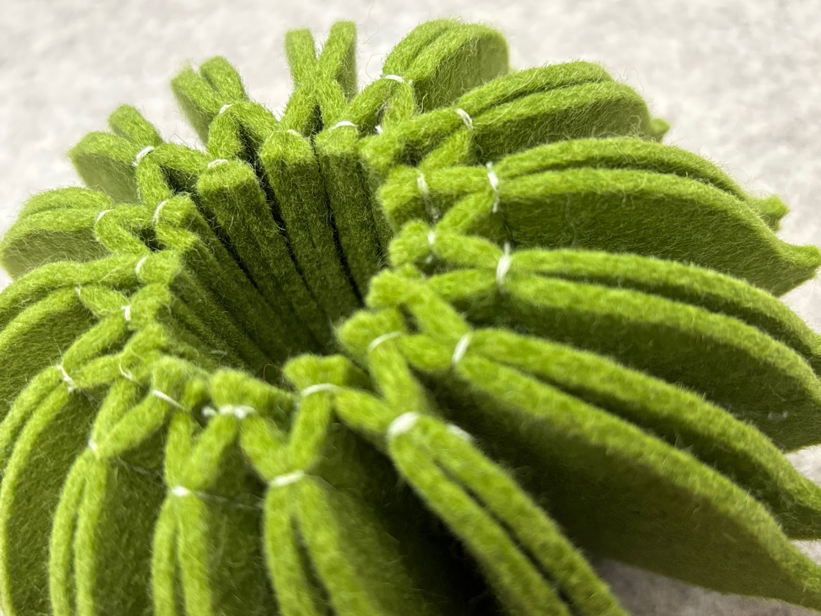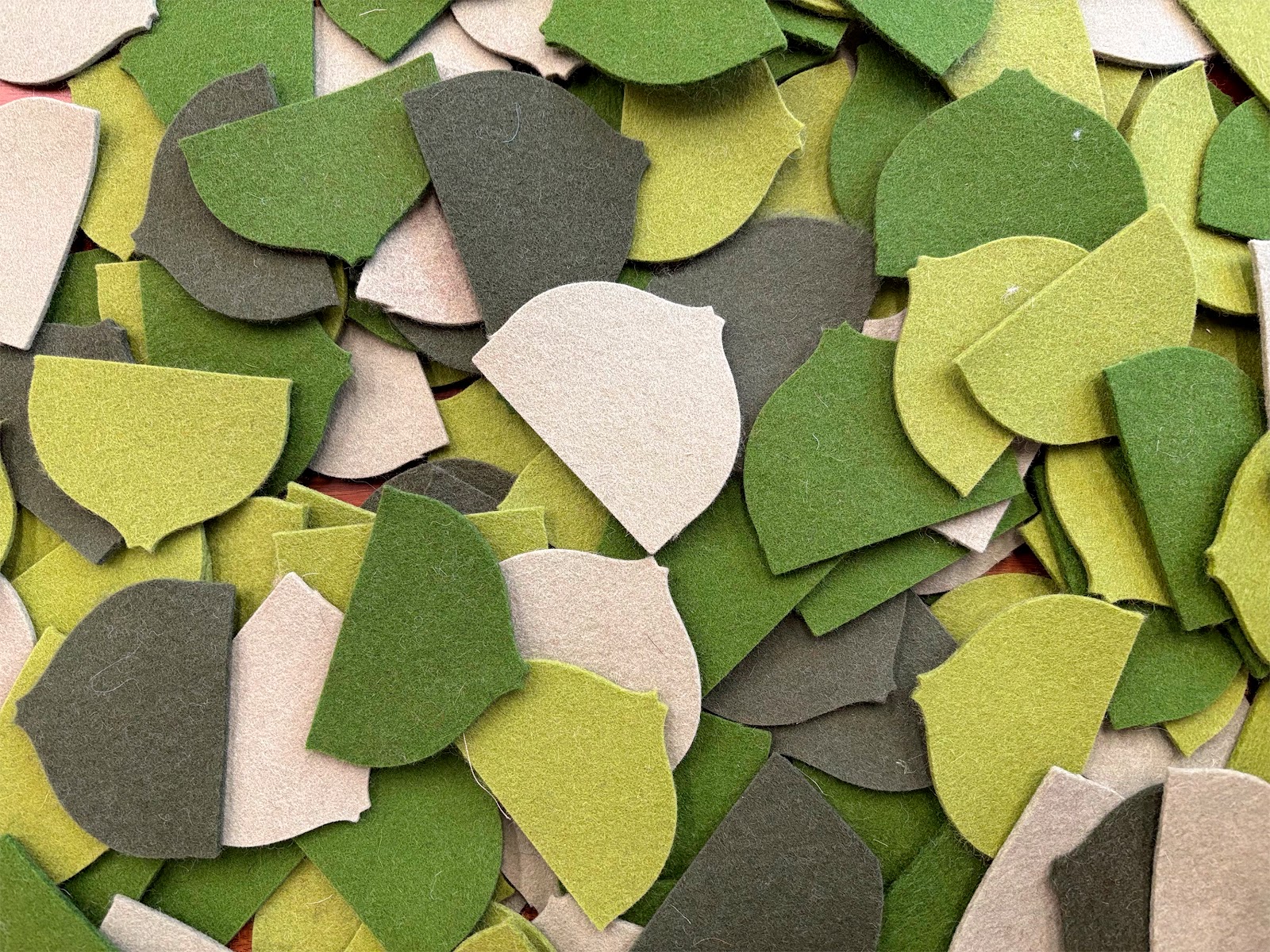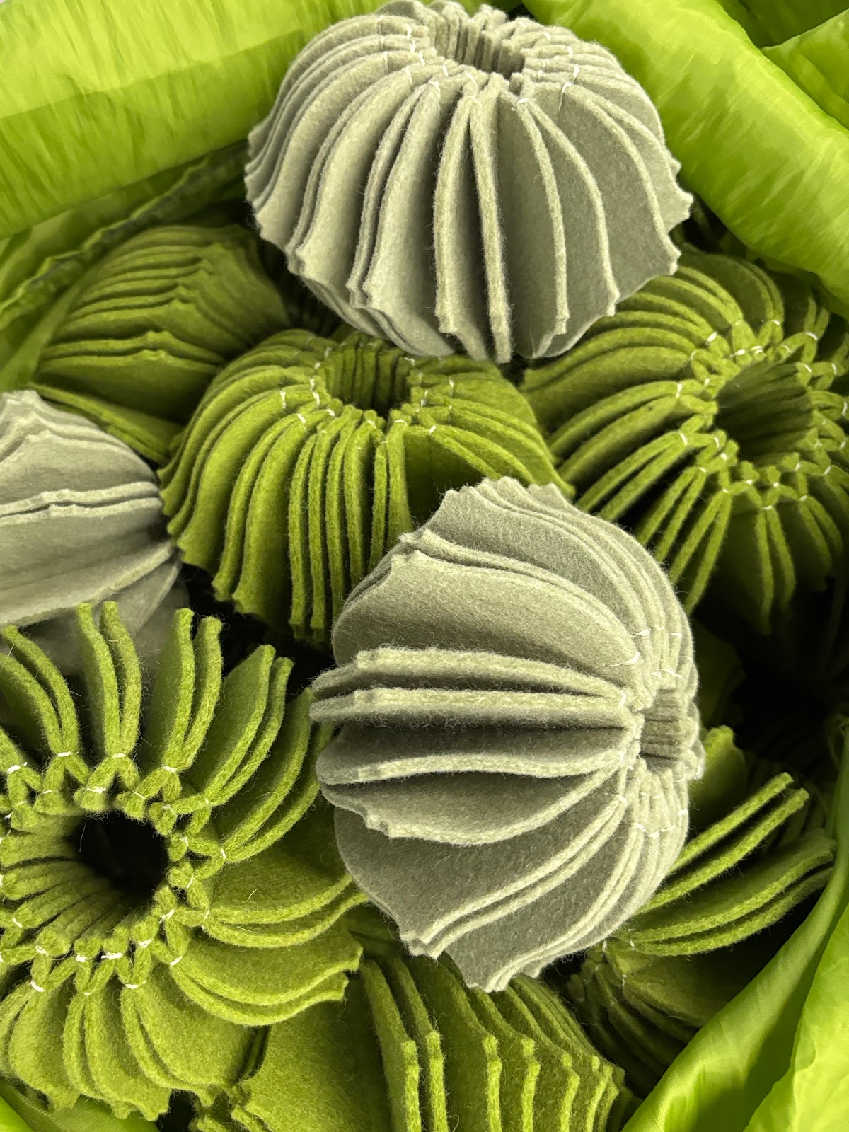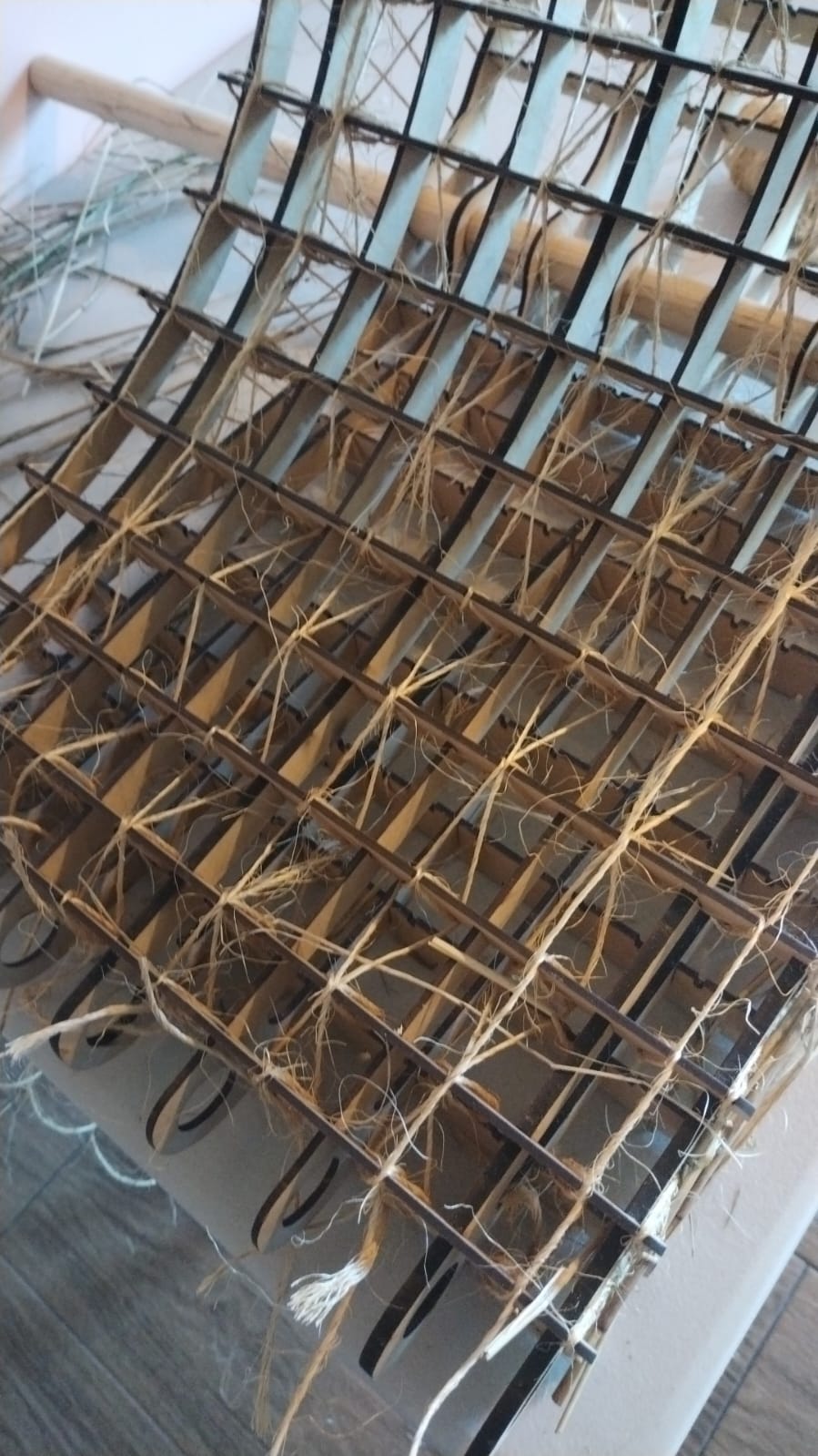 Tapiz tridimensional elaborado a partir de esferas de fieltro de lana hechas a mano, dispuestas en hileras suspendidas sobre tiras verticales que cuelgan libremente. Cada esfera aporta volumen, textura y movimiento al conjunto, creando un efecto rítmico y dinámico que evoca la vibración de un instrumento musical. Las tiras se fijan cuidadosamente a una base de madera de fresno, que actúa como soporte estructural y al mismo tiempo enmarca la pieza, resaltando la calidez de los materiales naturales y la armonía entre lo orgánico y lo geométrico.