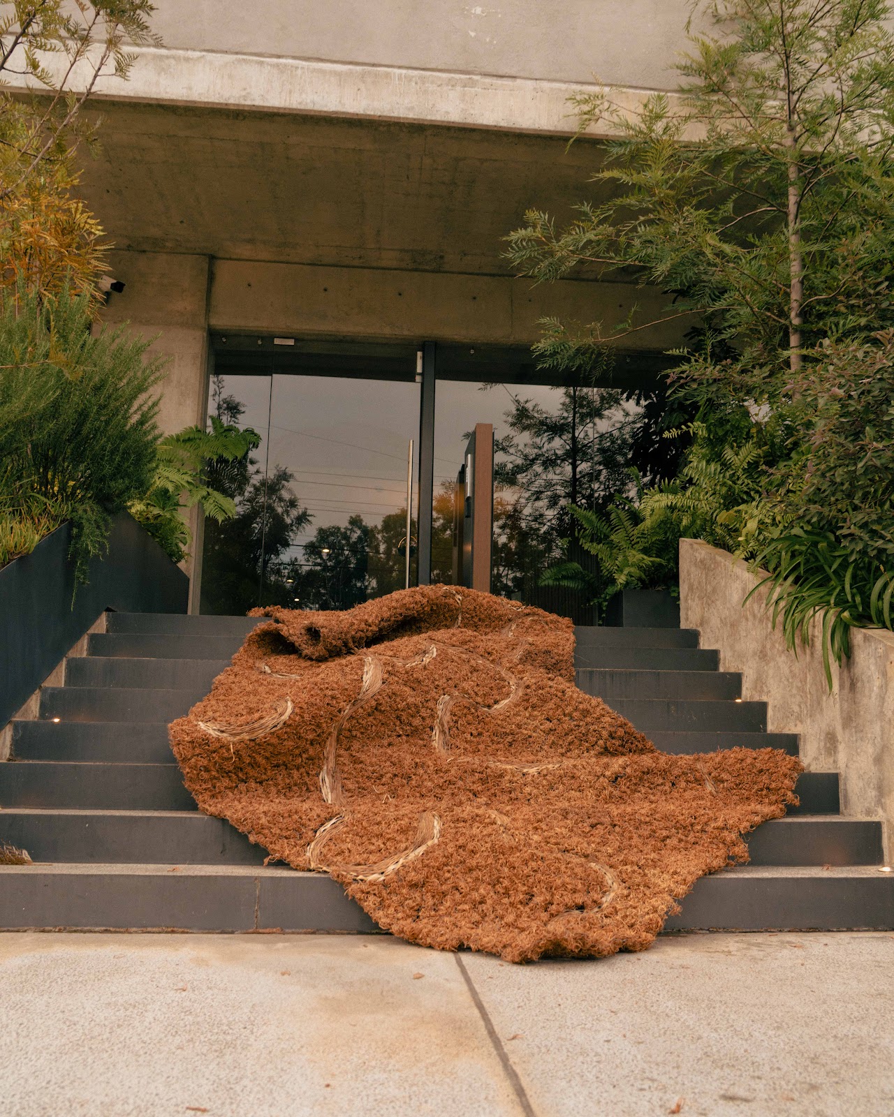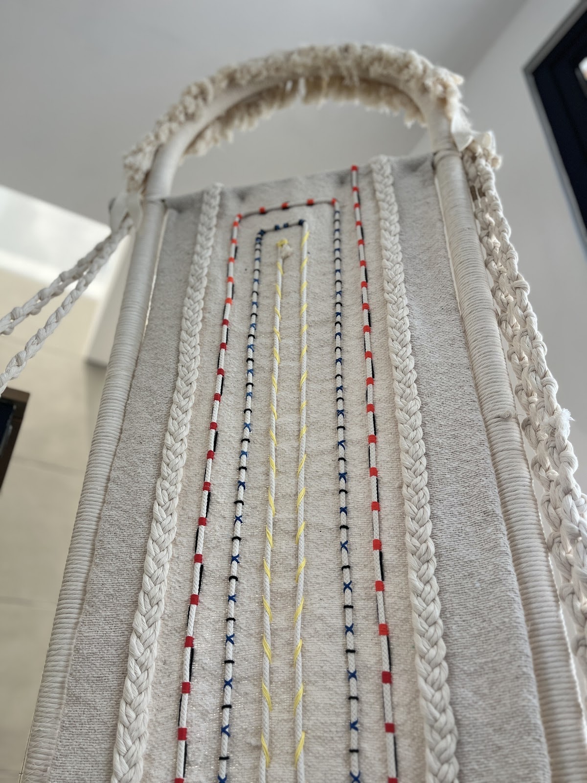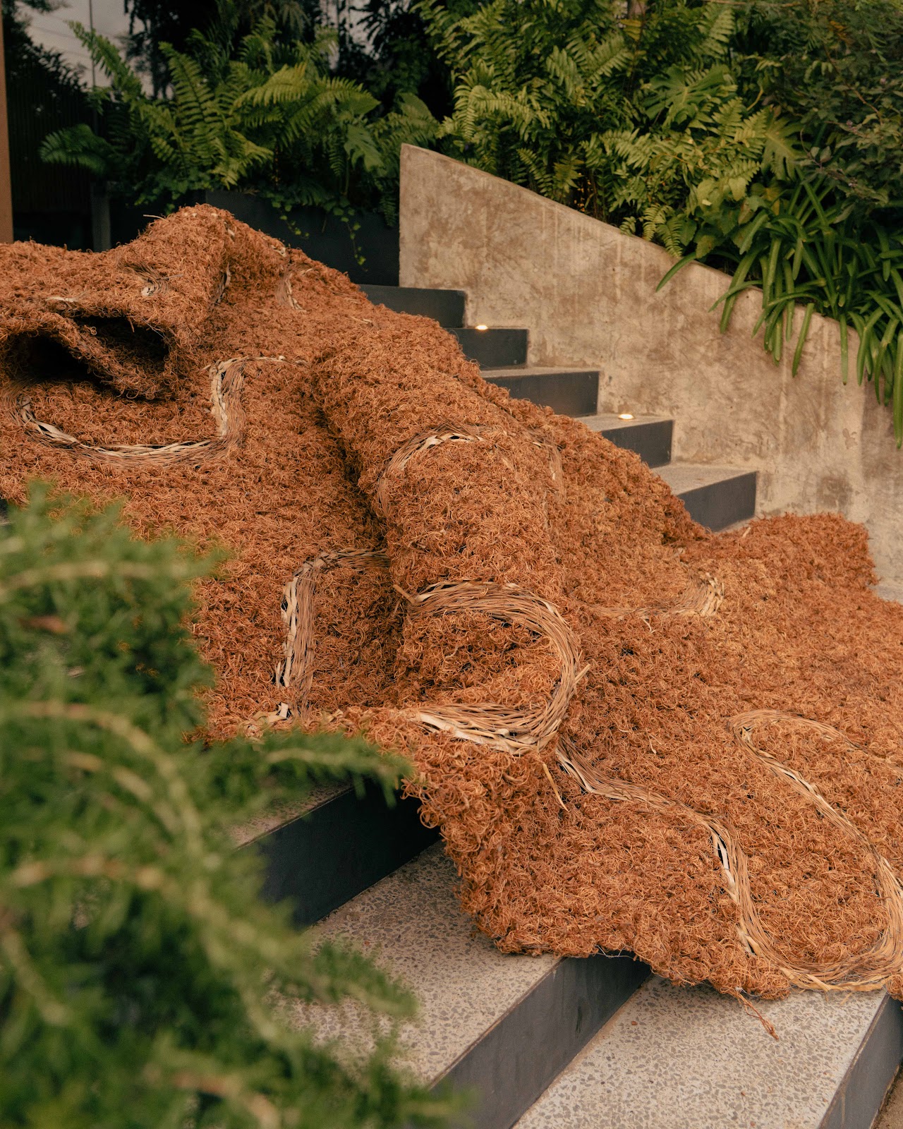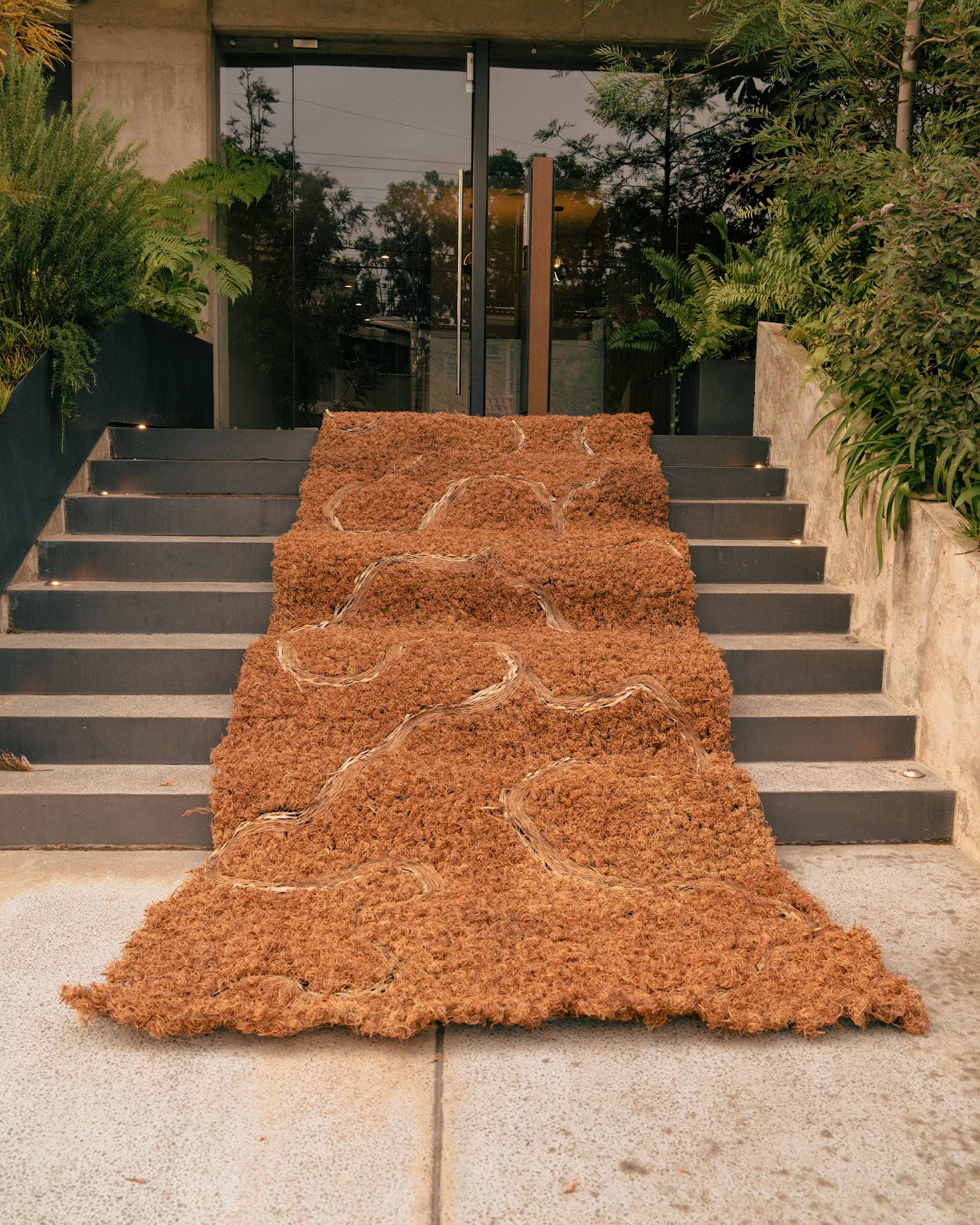 "Ecos y raíces” es una pieza de diseño textil elaborada con fibra de tamarindo, ocoxal y palma, materiales locales del estado de Jalisco. El tamarindo, al ser procesado para obtener productos como pulpa y dulces, genera un subproducto de cáscara y fibra que sostiene el fruto, mientras que la palma y el ocoxal son fibras presentes en bosques y playas de la región, comúnmente empleadas en técnicas tradicionales de cestería. Cada material fue tratado de acuerdo con sus necesidades específicas: al ser fibras semiduras, se humedecieron para obtener la maleabilidad adecuada. El tejido se realizó de manera artesanal utilizando malla de gallinero como base para entrelazar las fibras, que fueron unidas manualmente. El resultado es una pieza monumental de diseño textil, donde la fibra de tamarindo, el ocoxal y la palma se convierten en protagonistas, tejiendo una nueva forma de habitar y de conectar con el paisaje urbano.