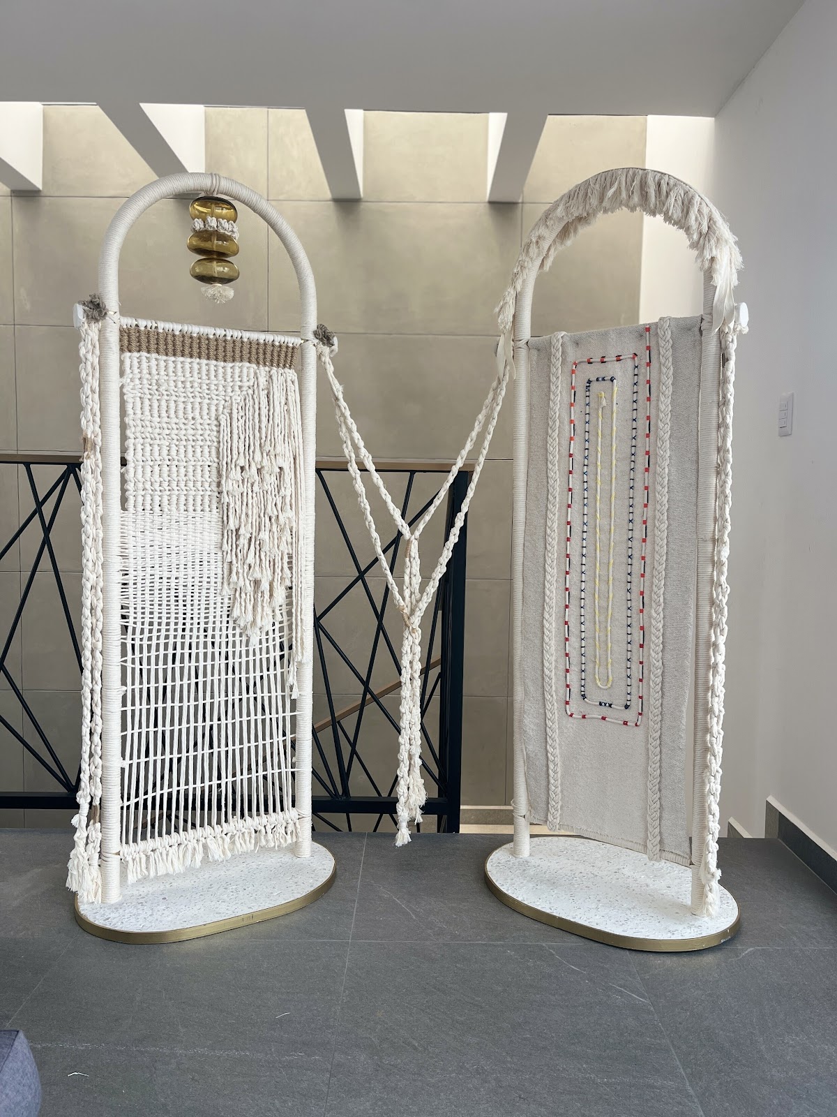 Técnica: Anudado contemporáneo y telar. Materiales: Ixtle, algodón y vidrio soplado. Estructuras de hierro, base de cemento blanco y ónix. SAZAJ nace como una ruptura interior: un acto de resistencia ante el “síndrome del impostor” y una declaración de fuerza identitaria. Esta obra representa la conexión simbólica entre dos generaciones de mujeres que se han sostenido mutuamente a través de la adversidad: la persistencia de una madre y la reinvención de una hija. La pieza combina dos estructuras metálicas en forma de arco que evocan columnas humanas que se sostienen y reflejan. El entramado del textil, muestra una narrativa contrastante: hilos definidos y densos que conviven con zonas abiertas y ligeras, en donde las emociones —como los pensamientos— se entrelazan, se tensan y se liberan.
