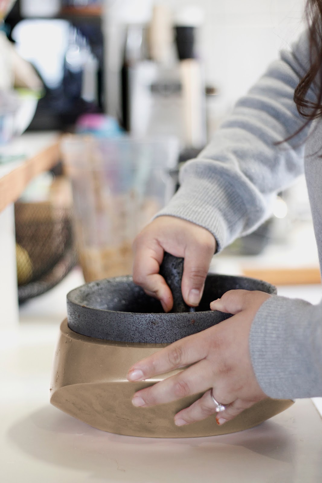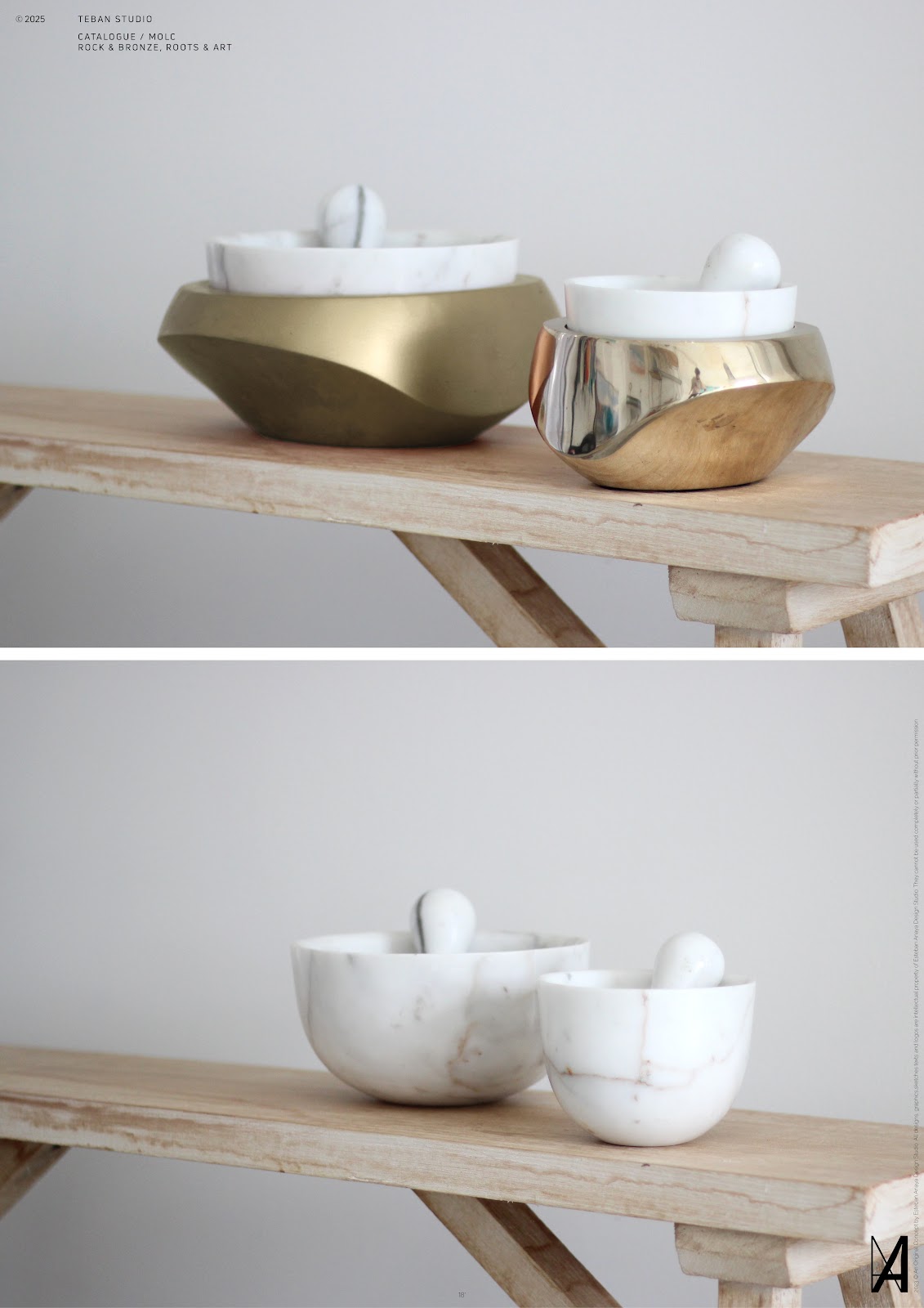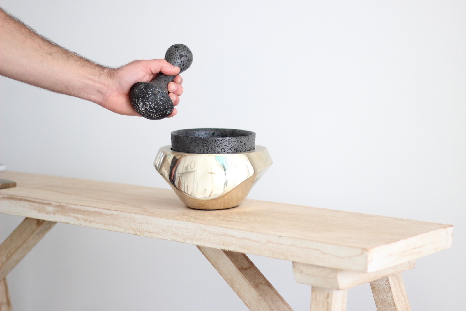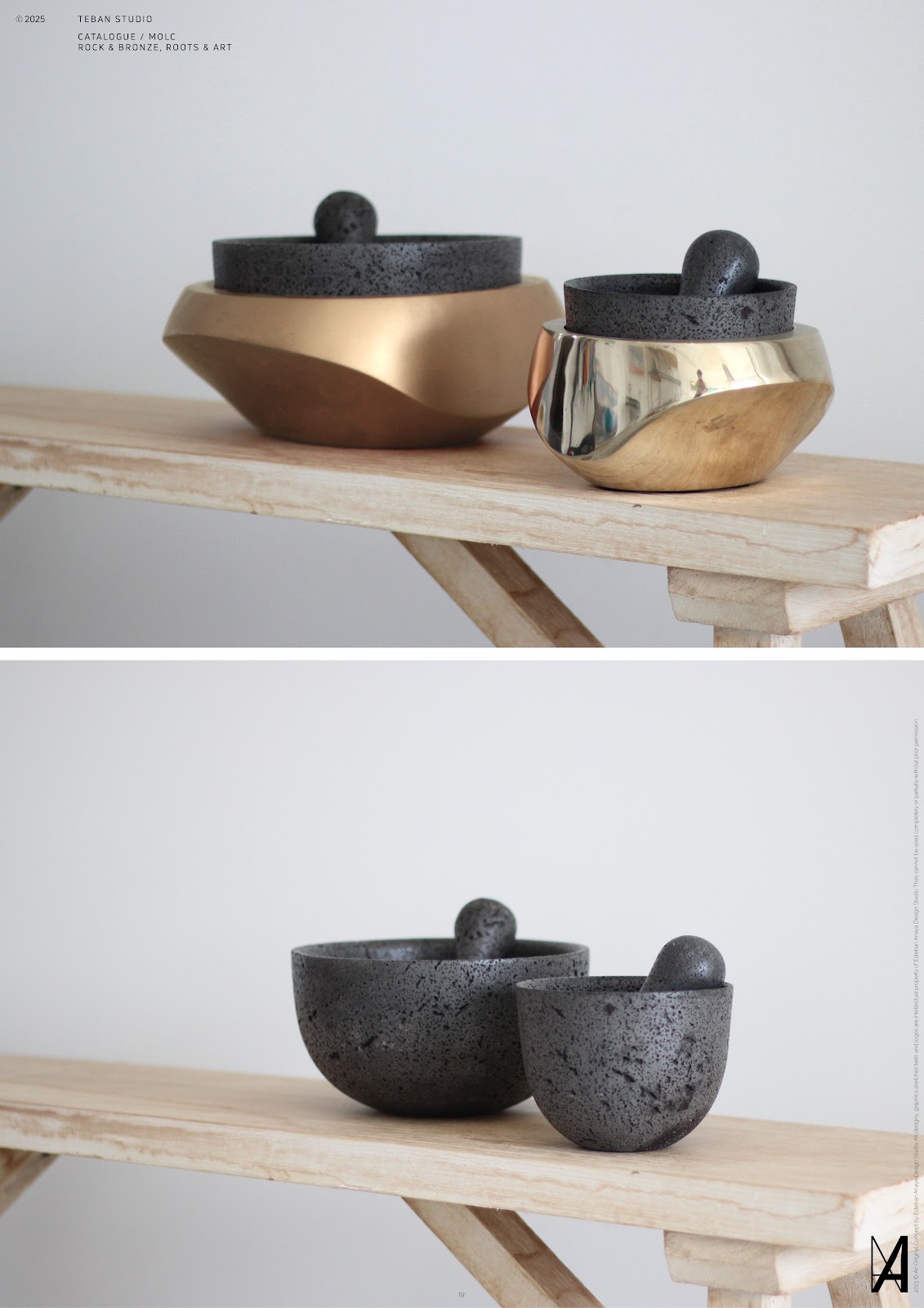 MOLC Piedra & Bronce / Raices & Arte DESCRIPCION Molc nace de un profundo amor por la cocina intencional, honrando los procesos artesanales y el patrimonio cultural Mexicano. Molc rinde homenaje al utensilio de cocina más antiguo de la historia de la humanidad, símbolo de unión, tradición y de los sabores que nos acompañan desde tiempos ancestrales. La base de bronce abraza cuidadosamnte la piedra, dándole la fuerza y rigidez necesarias, y al mismo tiempo ligereza y libertad para moverse cuando la receta lo pida. Cuando no está en uso, Molc transforma la tradición dejando de ser un utensilio que habita la cocina y se convierte en obra de arte. Más que un simple utensilio, Molc es una expresión de cultura, historia y devoción. Con profundo respeto por la tradición, se erige como una pieza contemporánea que sin olvidar su origen, continúa contando historias y acompañando mesas para las generaciones venideras EXTRACTO MOLC es una carta de amor al tradicional mortero mexicano, “el molcajete”. a través de su diseño y procesos ancestrales rinde homenaje a este humilde utensilio. celebrando a los artesanos y las manos que lo trabajan. MATERIALES BRONCE: Base de bronce fundido en arena de manera ancestral con acabado pulido a mano. Tipos de acabados para el bronce: Pulido brillante / Satinado / Pulido rugoso / Negro Avejentado PIEDRA: Bowl de piedra tallada y pulida a mano, a partir de un bloque solido de piedra. Tipos de piedra: Piedra Volcánica / Mármol de Carrara La piedra volvanica a sido utilizada por generaciones como “molcajete” Mexicano. Textura muy rugosa, ideal para moler y triturar. El marmol de carrara se ha utilizado tradicionalmente en la cocina Italiana. Textura suave, ideal para moler especias y crear pastas cremosas. PROCESO Cada MOLC es el resultado de un encuentro entre tradición y diseño, donde la piedra y el bronce dialogan para dar vida a un objeto que trasciende lo funcional. Fundición en bronce El proceso comienza con la fundición en arena. Un proceso completamente manual donde se moldea un molde a la vez. Con más de 3,000 años de historia, es una de las técnicas más antiguas de la humanidad. El bronce líquido se vierte cuidadosamente en los moldes, tomando la forma del mismo. Una vez solidificado, la pieza se pule a mano para revelar su brillo natural. Tallado de piedra De un bloque sólido de piedra, los artesanos canteros dan vida a cada bowl. Desde tiempos prehispánicos, el tallado de piedra ha sido parte de nuestra cultura. Mediante un proceso manual, con cincel, martillo y herramientas especializadas, se va retirando capa tras capa hasta revelar la forma deseada. Posteriormente, se pule con paciencia hasta resaltar la textura y el carácter único de cada bloque de piedra Encuentro de bronce y piedra Finalmente, la base de bronce abraza la piedra. El bronce aporta firmeza y estabilidad. Y la piedra ligereza y libertad cuando es retirada de su base. El resultado es una pieza irrepetible, donde se pueden ver las huellas del trabajo humano. Más que un utensilio, MOLC es una obra de arte funcional que celebra la herencia mexicana, honra a los artesanos y da vida a las historias que nos unen alrededor de la mesa.