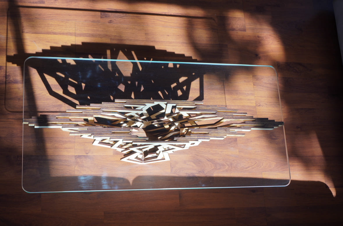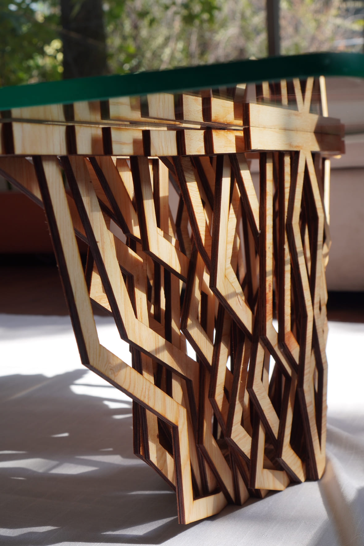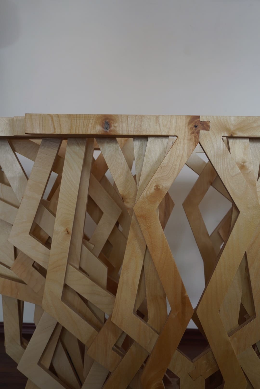 Mesa Mz surge como una reflexión sobre la resiliencia y la posibilidad de florecer aun en condiciones adversas. La pieza demuestra que, aunque una estructura pueda parecer frágil, inestable o improbable, con las condiciones adecuadas puede mantenerse firme y crecer. Su diseño incorpora trazos rectos que remiten a motivos prehispánicos, jugando con ellos para generar formas geométricas visibles tanto desde la vista frontal como desde la superior. La mesa está fabricada en triplay de abedul, con una base de metal que refuerza la estructura, recordando que incluso en la adversidad existen oportunidades para sostenerse y prosperar. El proceso de creación fue acelerado: en tan solo tres semanas se concretó la pieza, inspirada en la temática de Maleza presentada en el Abierto Mexicano de Diseño. La idea de lo frágil pero resiliente cautivó al diseñador, dando origen a Mesa Mz, un objeto que encarna el concepto de resistencia y la capacidad de crear frente a todas las posibilidades.