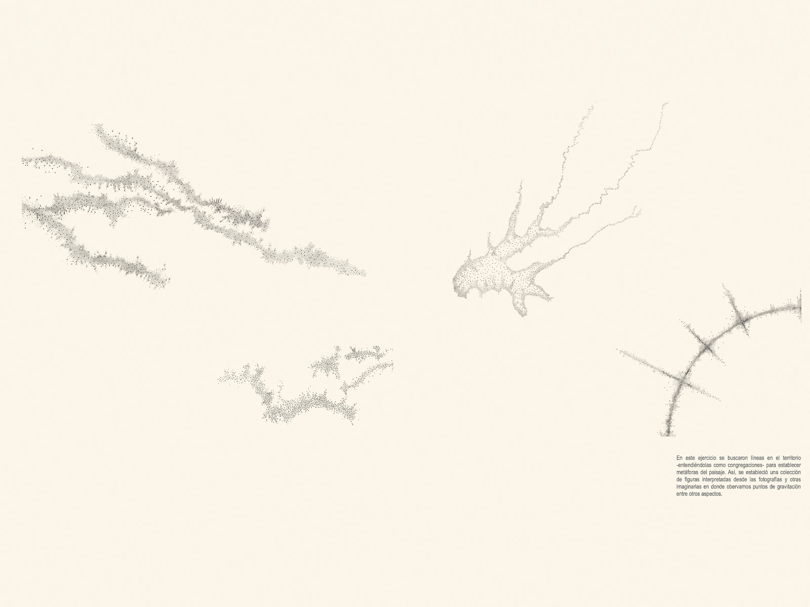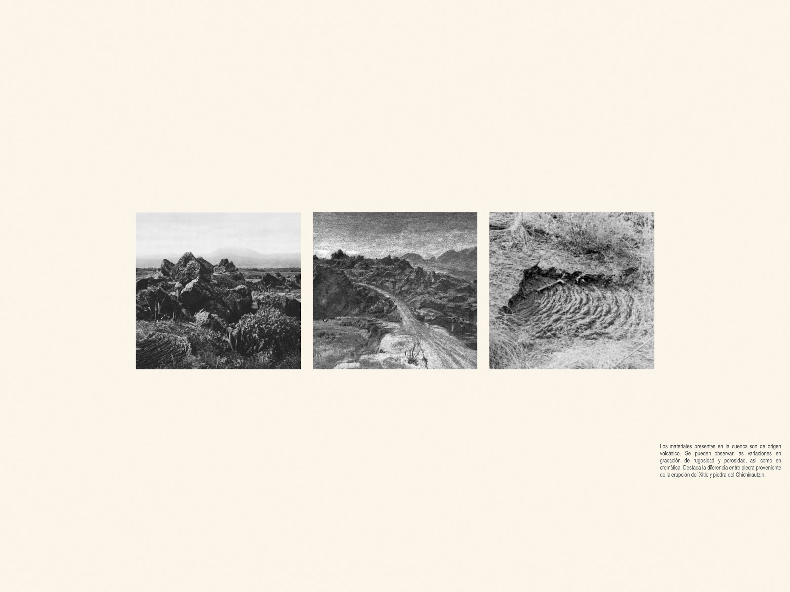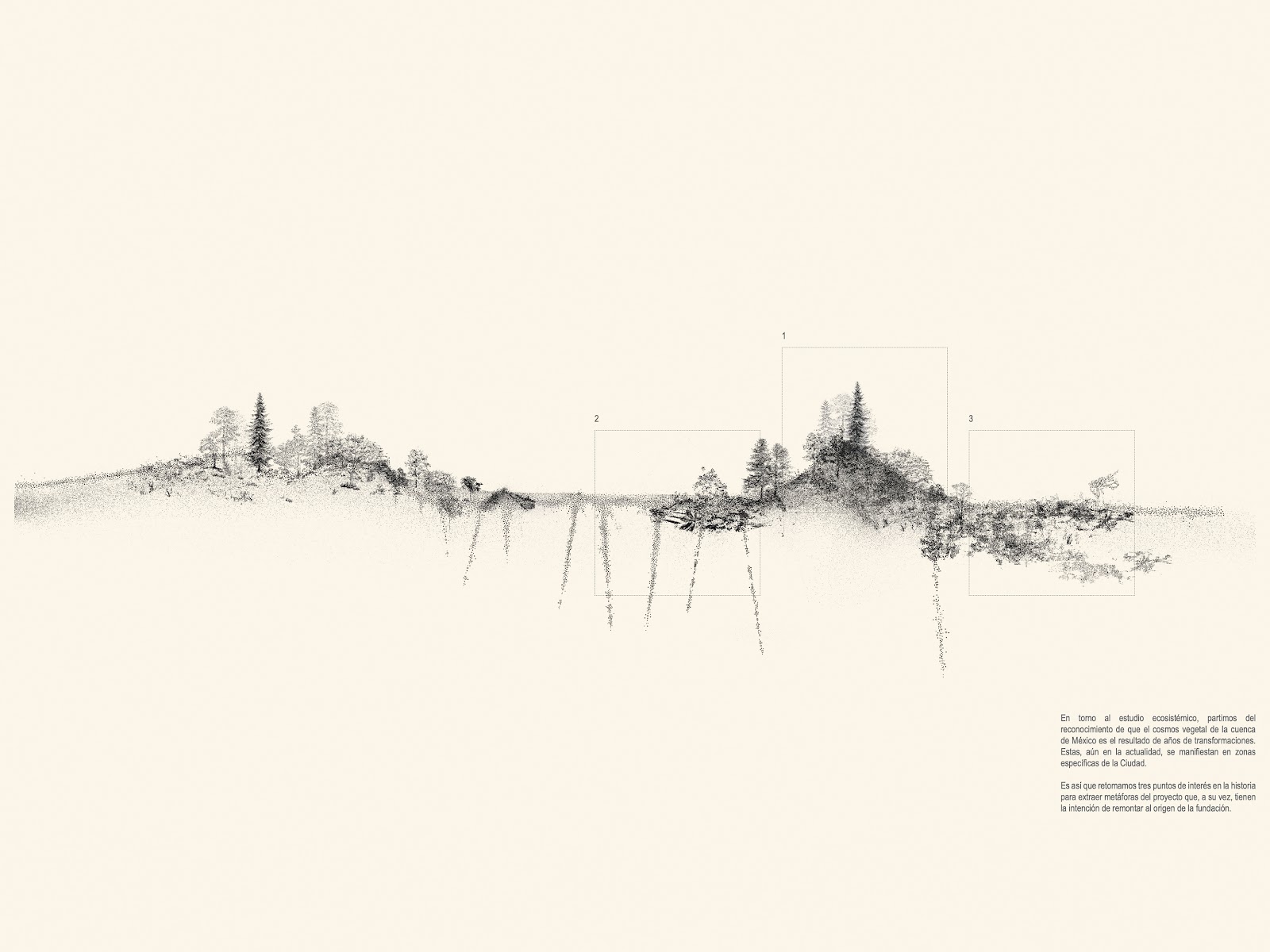 Ver ubicaciónLa Cuenca surge a partir de la eclosión de las sierras que la delimitan: Sierra de las Cruces y Chichinautzin. Su aspecto geológico constituye un fenómeno multicapa en el que destaca lo hídrico como elemento clave en la formación del suelo. Desde un enfoque ecosistémico, el estudio parte del reconocimiento de que el cosmos vegetal de la Cuenca de México es el resultado de años de transformaciones, manifestadas aún en la actualidad en zonas específicas de la ciudad. Se identifican tres puntos de interés históricos y ecológicos: Sotobosque de coníferas y estrato bajo de matorral de transición, donde la vegetación, aunque no predominante, crece de manera uniforme siguiendo los patrones del suelo y se refugia incluso en espacios pequeños gracias a su fina estructura. Jardín urbano, que incluye especies introducidas a lo largo del último siglo, y que responde a intereses y necesidades culturales, satisfaciendo funciones estéticas, alimenticias, de sombra, construcción e incluso tintes. Baldío urbano, con especies espontáneas que crecen en suelos complejos de manera indiscriminada, mostrando tendencias alargadas en su crecimiento. Tomando la teoría del paisaje, el movimiento escalar permite apreciar la materia como una masa descontextualizada que guarda en su interior todas las formas del universo. Las estructuras de organización macro y micro —redes, sistemas nodulares, ecótopos, clusters— se relacionan, permitiendo que un bosque pueda estar contenido en una masa de musgo y la geología de una región en una sola piedra. Estos principios se condensan en la idea de microcosmos, donde en una pequeña porción de espacio se intuye una región o incluso el cosmos completo mediante la mímesis de fenómenos geológicos, botánicos y biológicos. El ejercicio buscó líneas en el territorio, entendidas como congregaciones, para establecer metáforas del paisaje. Esto dio lugar a una colección de figuras interpretadas a partir de fotografías y de la imaginación, observando puntos de gravedad y otras características del ecosistema. La conclusión de este análisis se presenta mediante una infografía impresa, acompañada de una pieza representativa de la Cuenca de México, que sintetiza la relación entre geología, vegetación y estructura del paisaje.